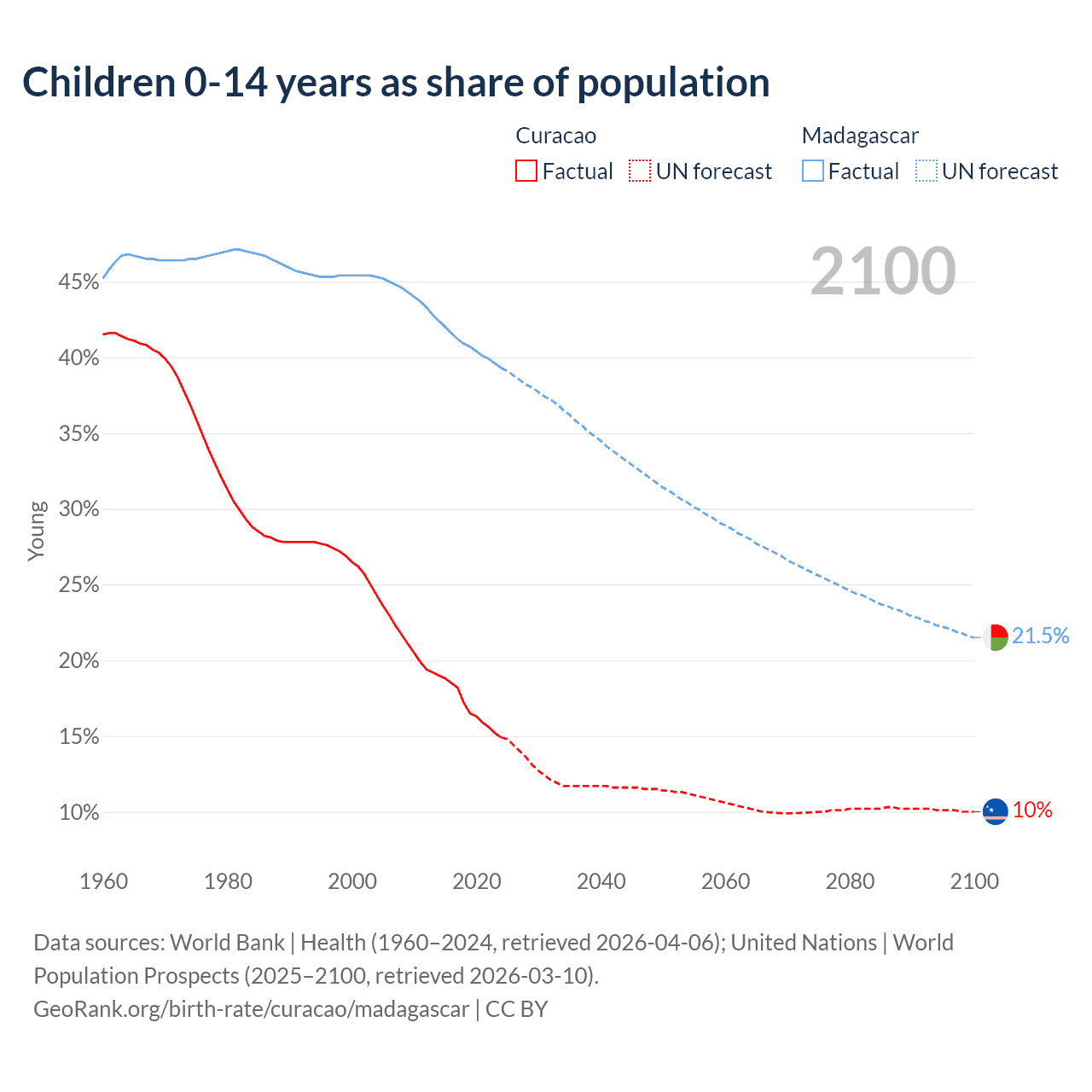According to the latest available data on birth rates, the fertility rate in Curacao was 1.2 children per woman in 2023, compared to 3.97 in Madagascar in 2023. The replacement level is considered to be 2.1 children per woman.