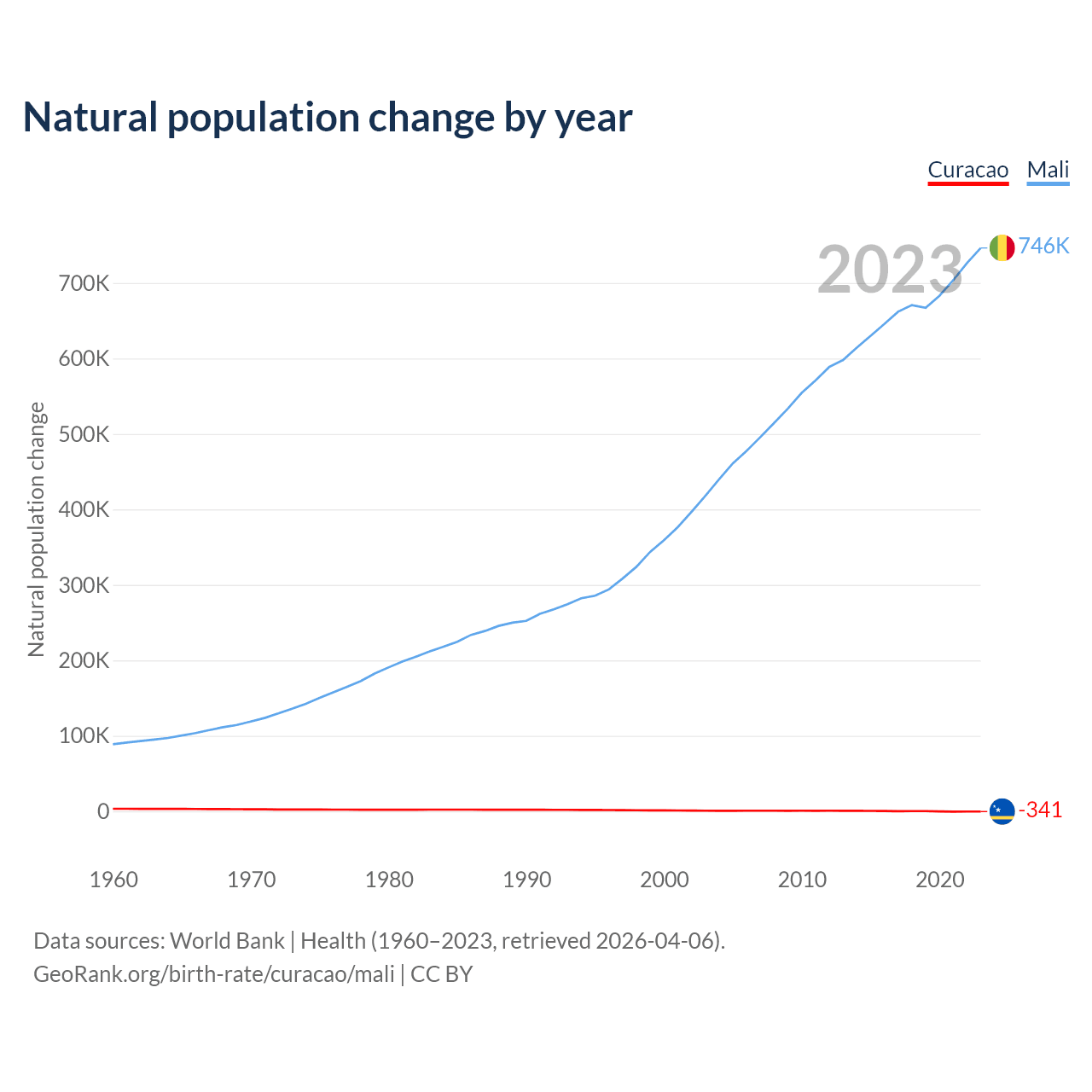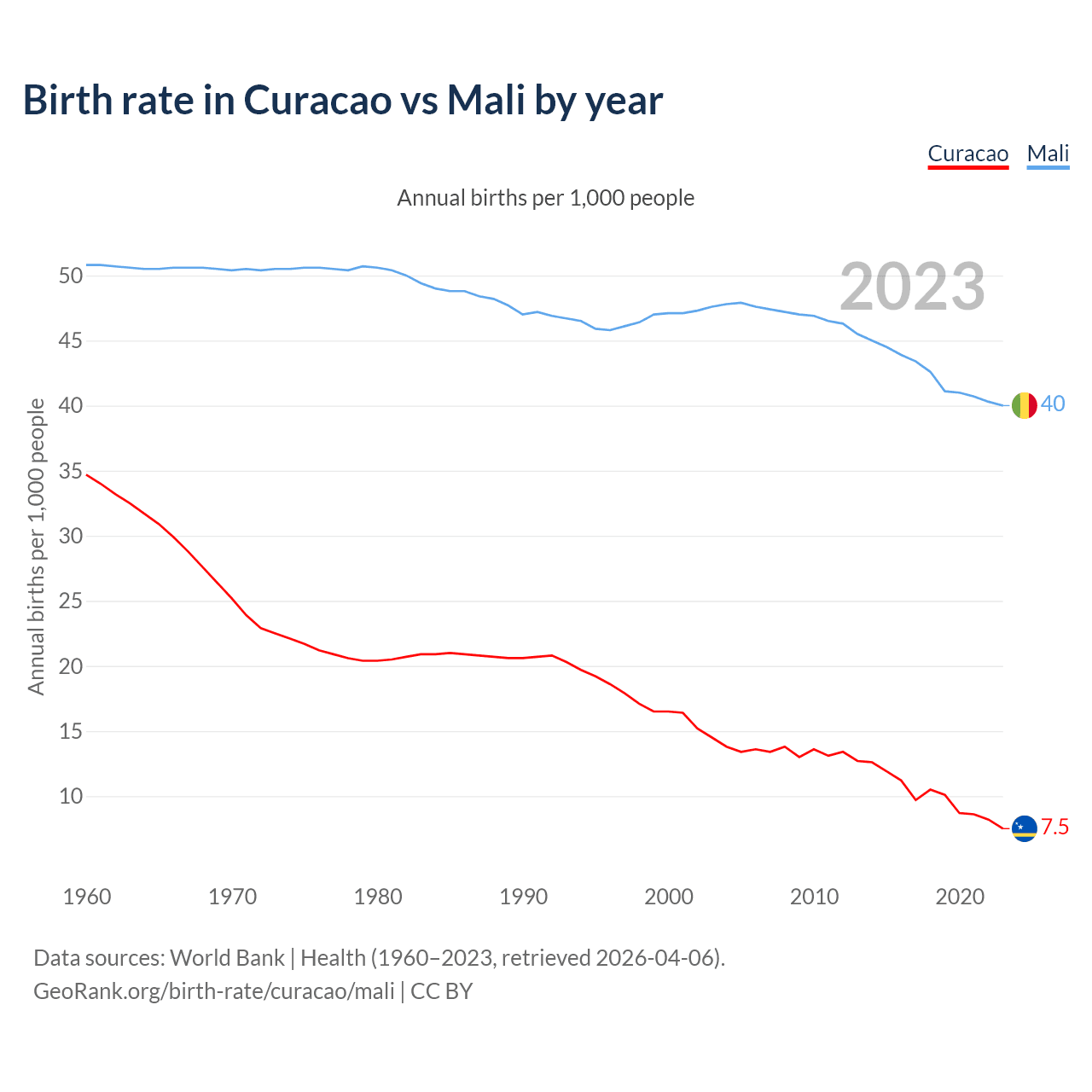 Curacao has an annual birth rate of 7.5 births per 1,000 people, compared to 40 for Mali. The average number of children a woman is expected to have during her lifetime — the fertility rate, is 1.2 in Curacao and 5.61 in Mali — 368% difference.