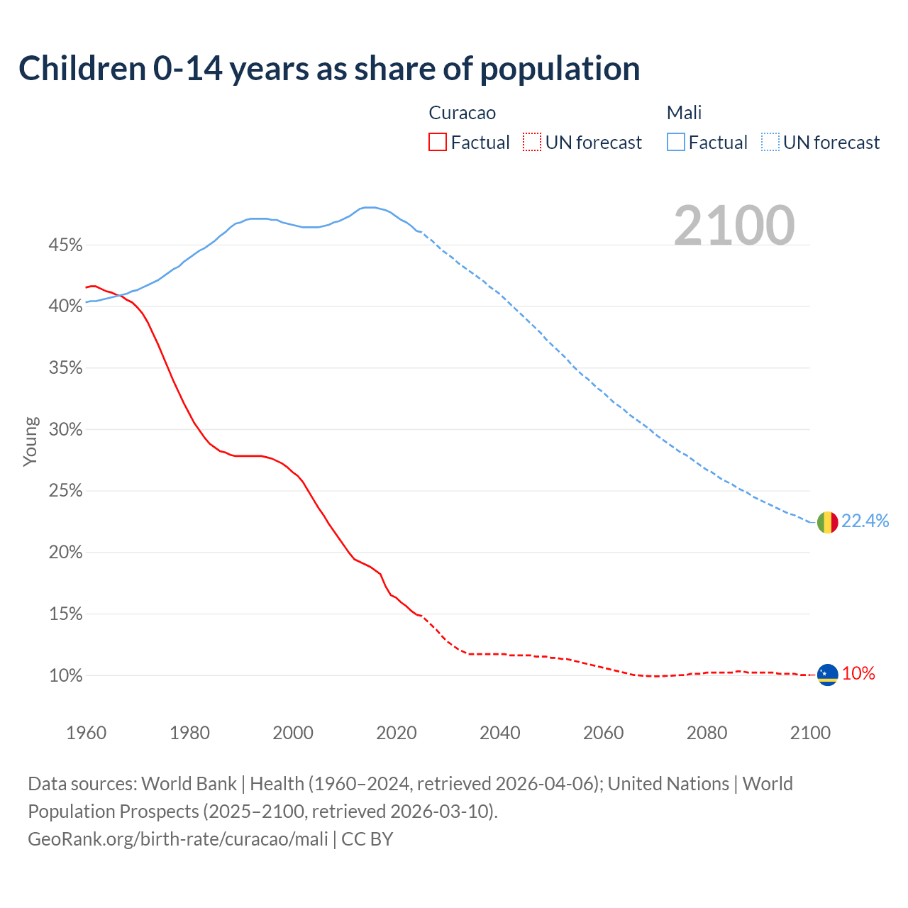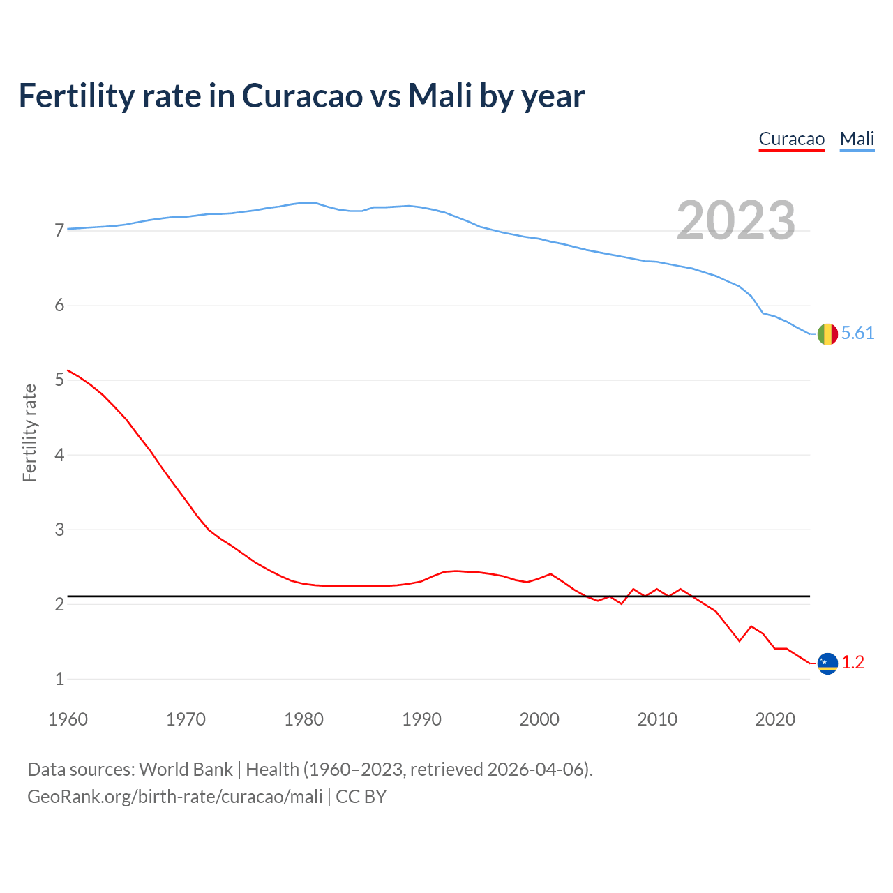 According to the latest available data on birth rates, the fertility rate in Curacao was 1.2 children per woman in 2023, compared to 5.61 in Mali in 2023. The replacement level is considered to be 2.1 children per woman.