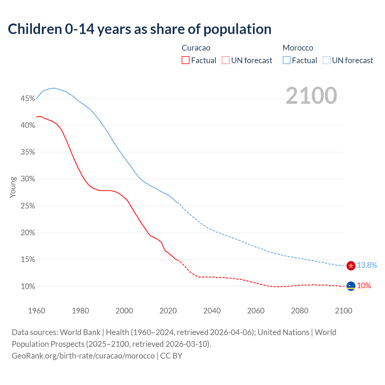 According to the latest available data on birth rates, the fertility rate in Curacao was 1.2 children per woman in 2023, compared to 2.23 in Morocco in 2023. The replacement level is considered to be 2.1 children per woman.
