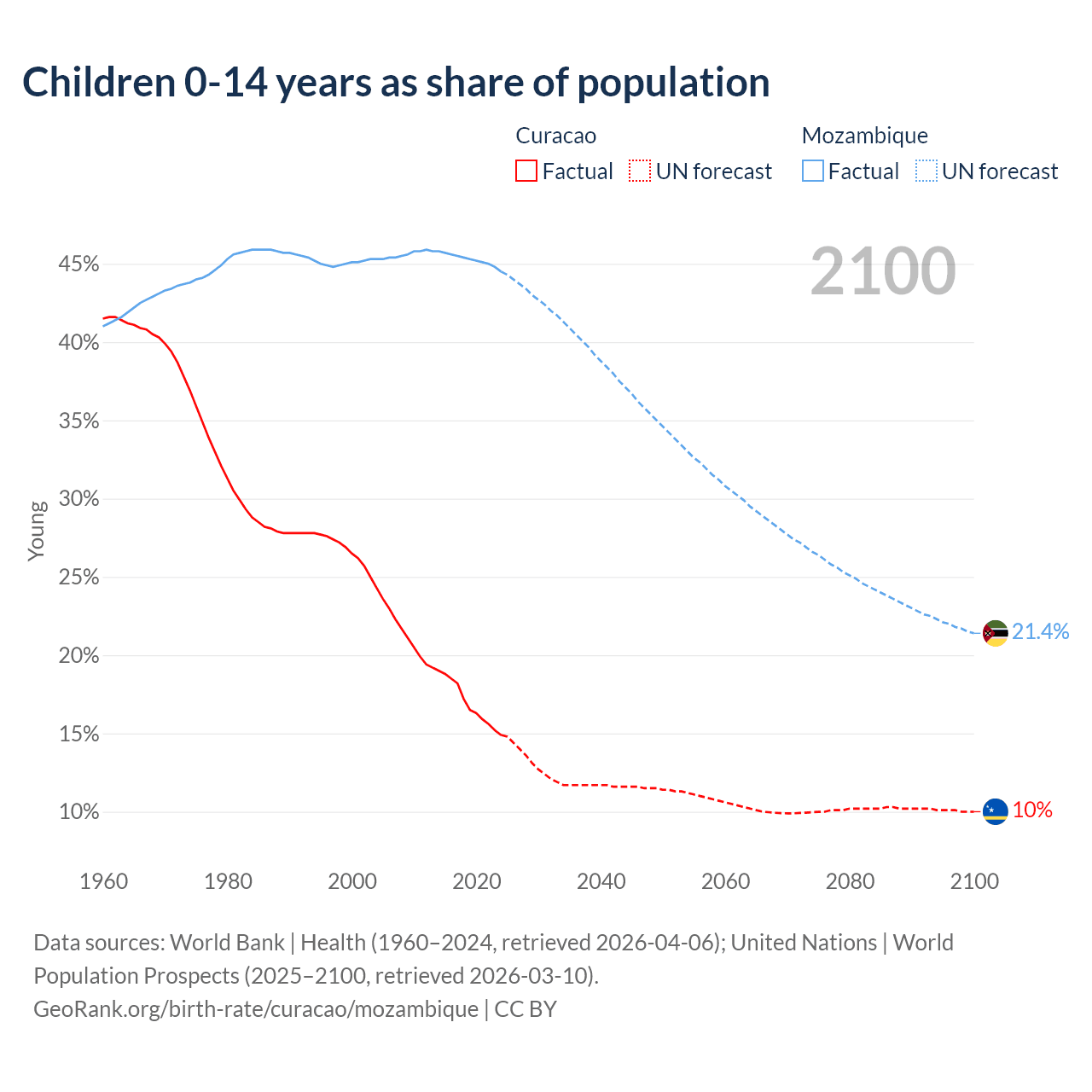 According to the latest available data on birth rates, the fertility rate in Curacao was 1.2 children per woman in 2023, compared to 4.76 in Mozambique in 2023. The replacement level is considered to be 2.1 children per woman.