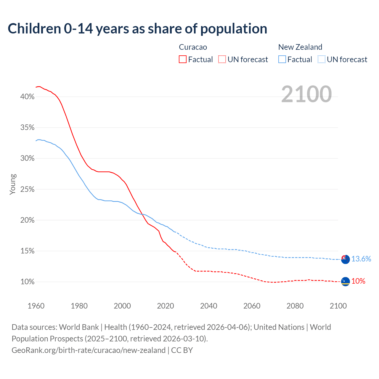Children aged 0-14 make up 14.9% of the population in Curacao and 18.1% in New Zealand in 2024, compared to 27.8% and 23.3% respectively in 1990.