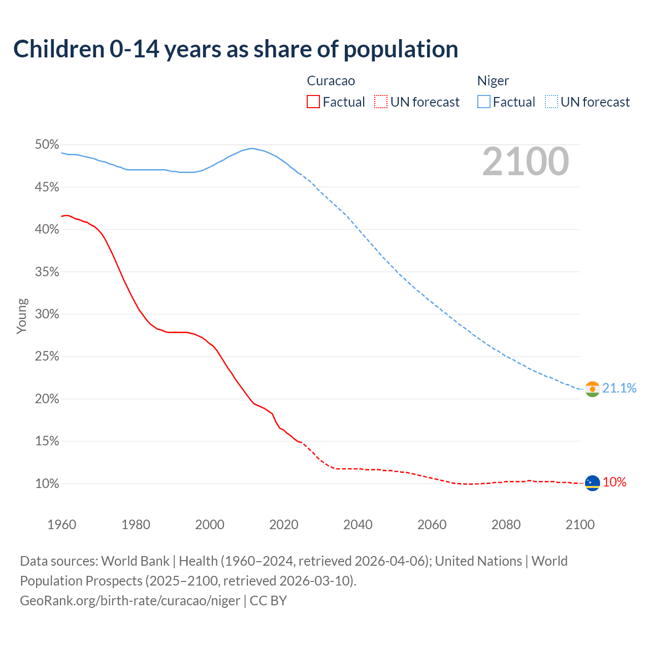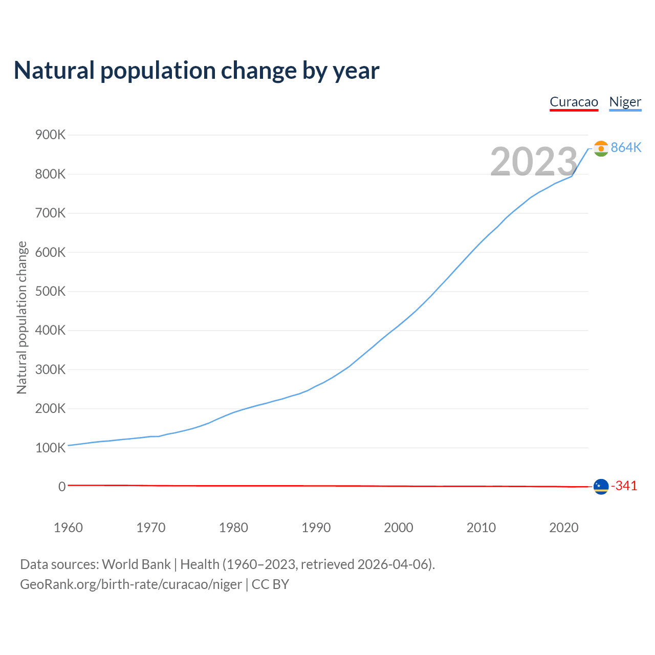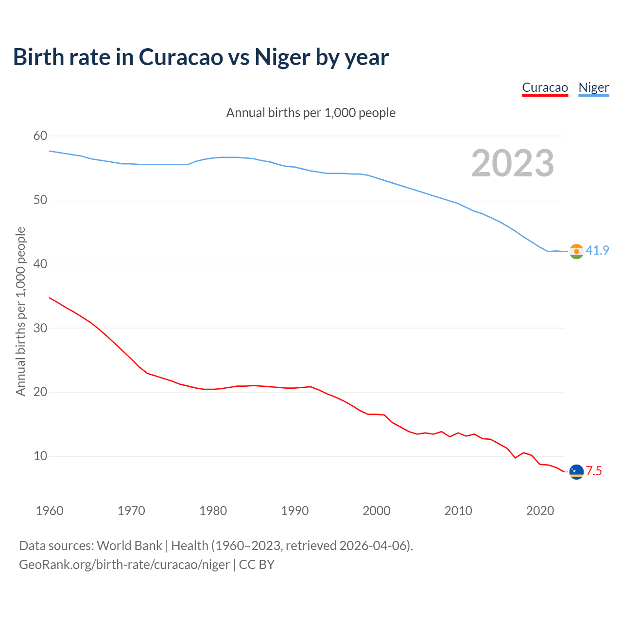 Curacao has an annual birth rate of 7.5 births per 1,000 people, compared to 41.9 for Niger. The average number of children a woman is expected to have during her lifetime — the fertility rate, is 1.2 in Curacao and 6.06 in Niger — 405% difference.