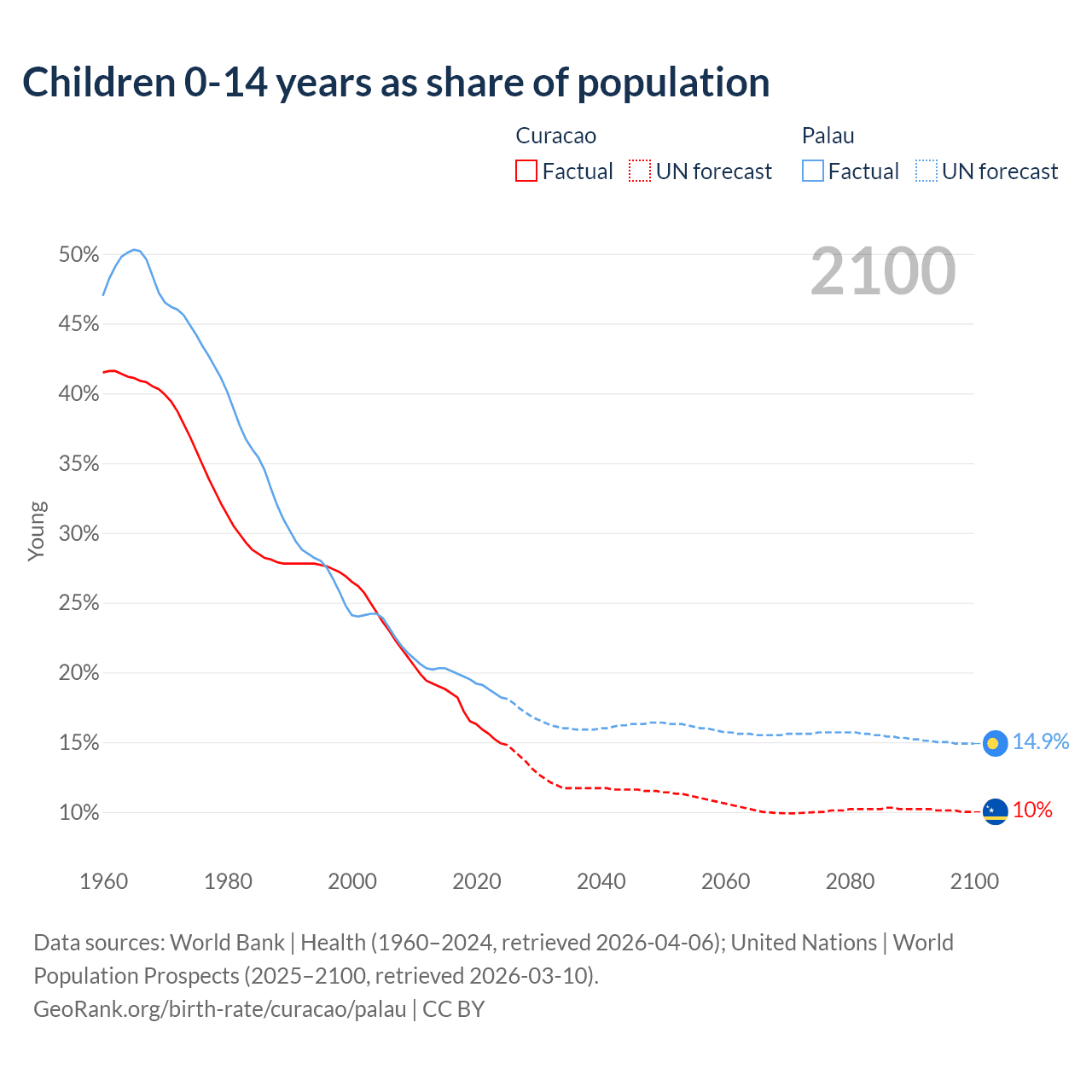 Children aged 0-14 make up 14.9% of the population in Curacao and 18.2% in Palau in 2024, compared to 27.8% and 30.2% respectively in 1990.