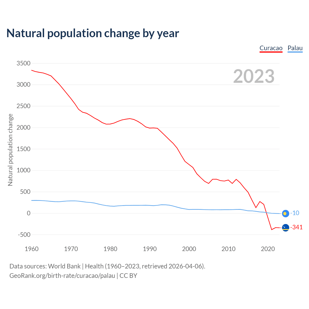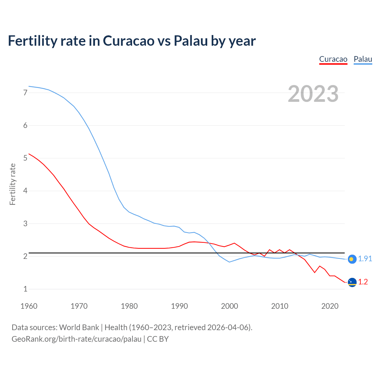According to the latest available data on birth rates, the fertility rate in Curacao was 1.2 children per woman in 2023, compared to 1.91 in Palau in 2023. The replacement level is considered to be 2.1 children per woman.