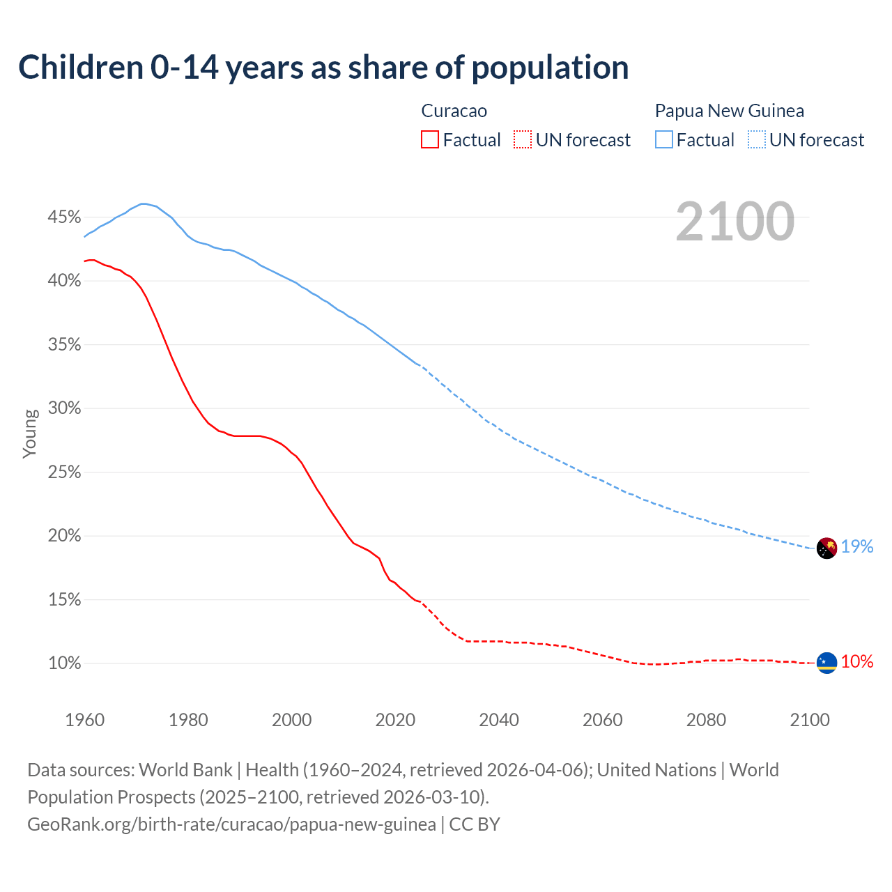 Children aged 0-14 make up 14.9% of the population in Curacao and 33.5% in Papua New Guinea in 2024, compared to 27.8% and 42.1% respectively in 1990.