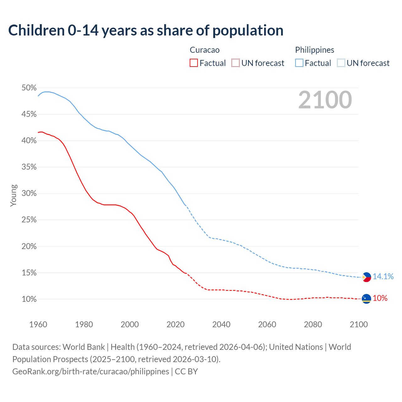 Children aged 0-14 make up 14.9% of the population in Curacao and 27.9% in the Philippines in 2024, compared to 27.8% and 41.8% respectively in 1990.