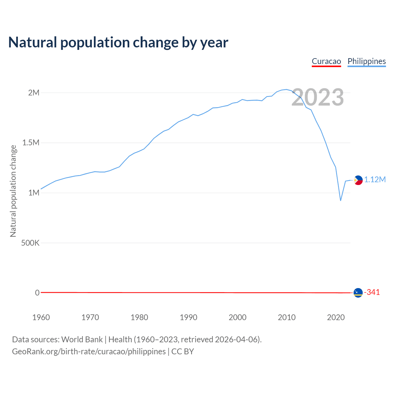 According to the latest available data on birth rates, the fertility rate in Curacao was 1.2 children per woman in 2023, compared to 1.92 in the Philippines in 2023. The replacement level is considered to be 2.1 children per woman.