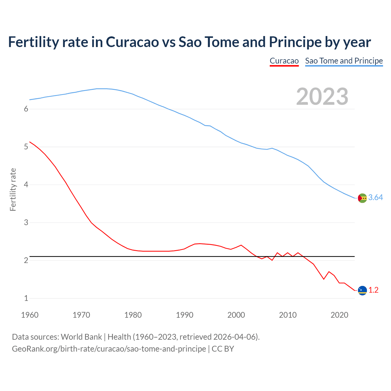 1960 vs 2023, the fertility rate has decreased by 76.6% in Curacao and by 41.6% in Sao Tome and Principe — in 1960, it was 5.13 and 6.24, respectively.