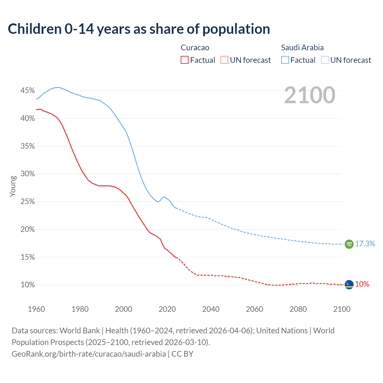 According to the latest available data on birth rates, the fertility rate in Curacao was 1.2 children per woman in 2023, compared to 2.28 in Saudi Arabia in 2023. The replacement level is considered to be 2.1 children per woman.