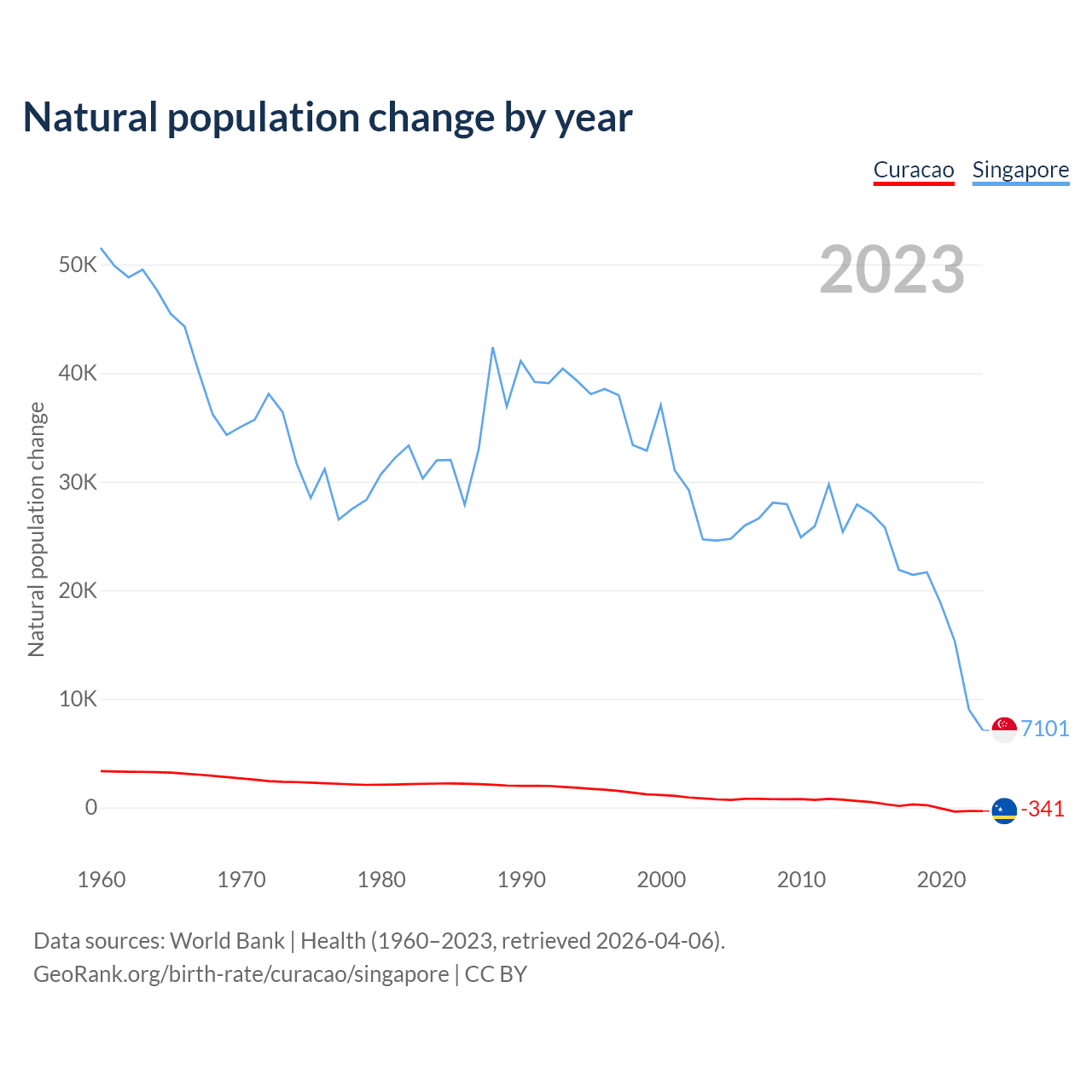 According to the latest available data on birth rates, the fertility rate in Curacao was 1.2 children per woman in 2023, compared to 0.97 in Singapore in 2023. The replacement level is considered to be 2.1 children per woman.