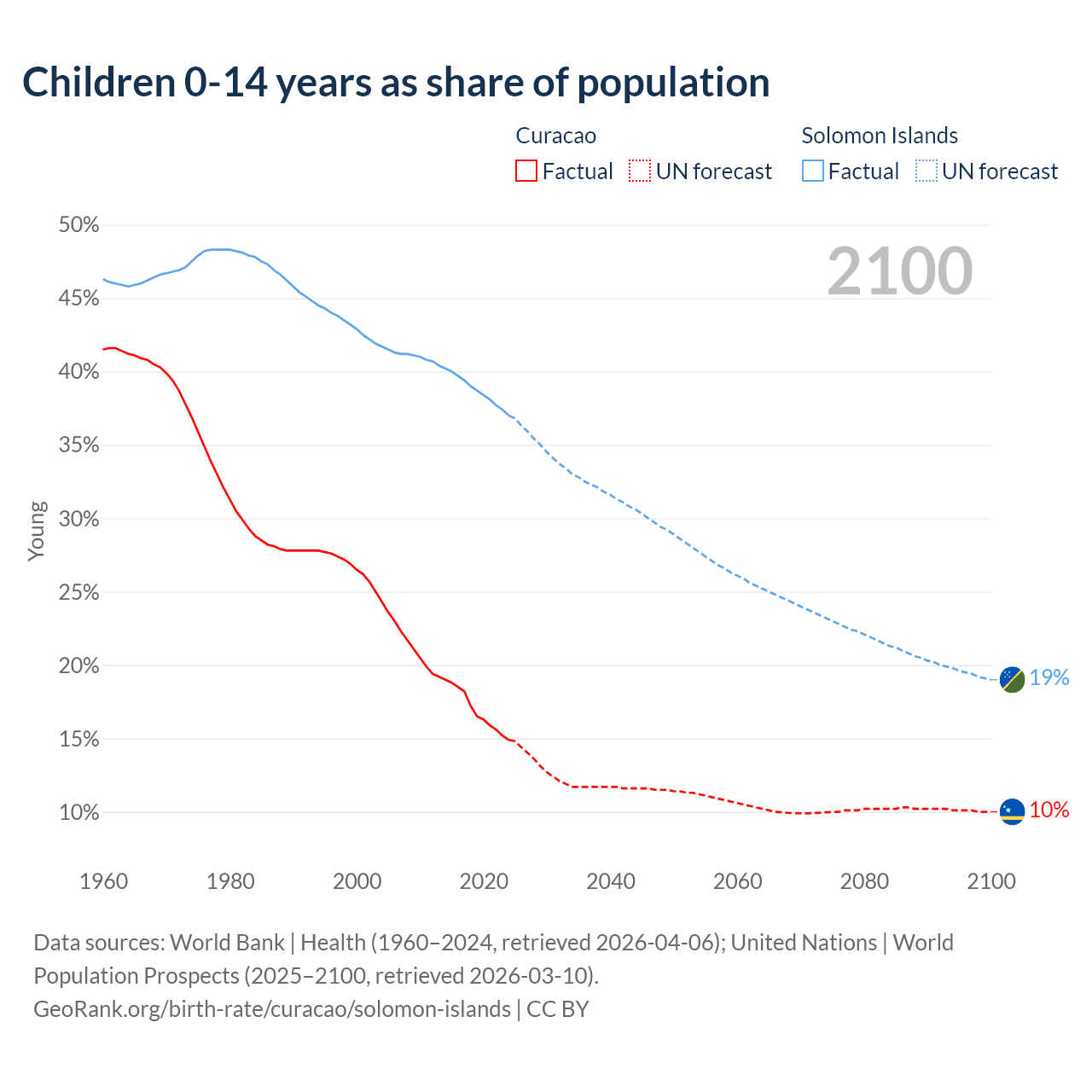 Children aged 0-14 make up 14.9% of the population in Curacao and 37% in the Solomon Islands in 2024, compared to 27.8% and 45.8% respectively in 1990.