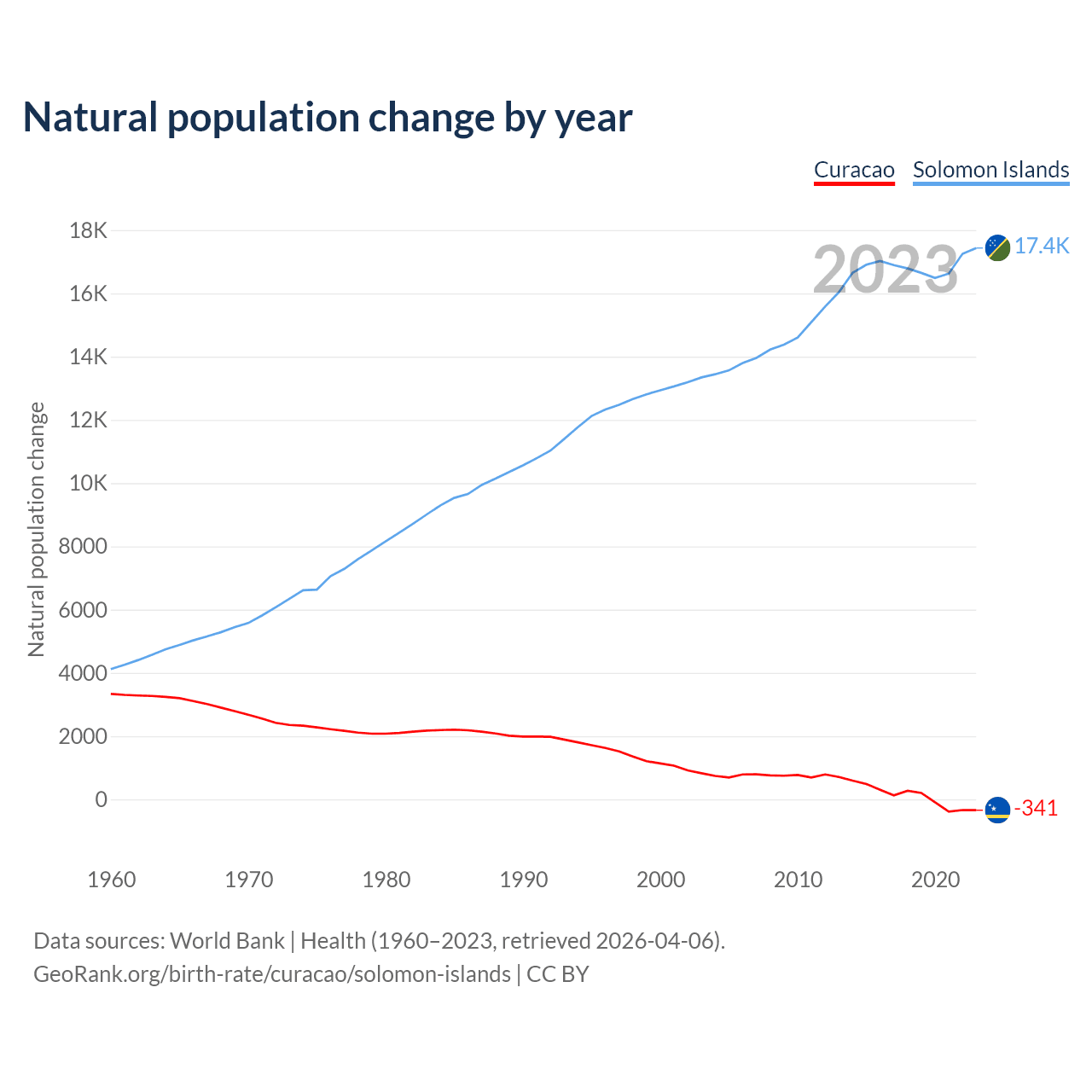 Curacao has an annual birth rate of 7.5 births per 1,000 people, compared to 26.9 for the Solomon Islands. The average number of children a woman is expected to have during her lifetime — the fertility rate, is 1.2 in Curacao and 3.56 in the Solomon Islands — 196.4% difference.