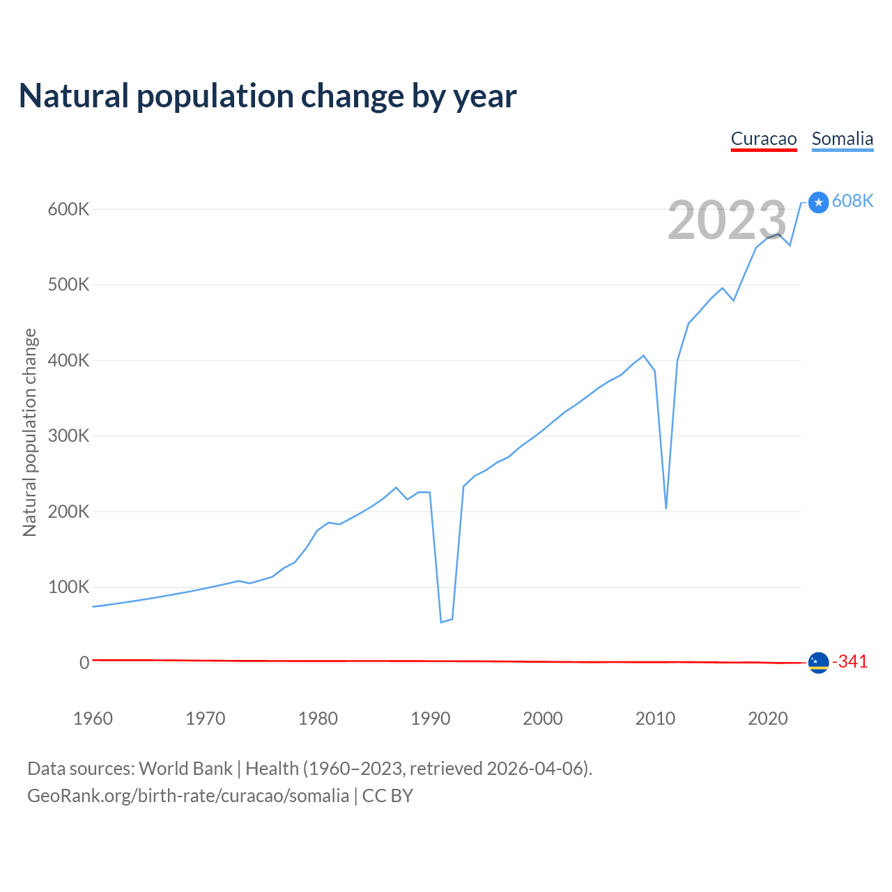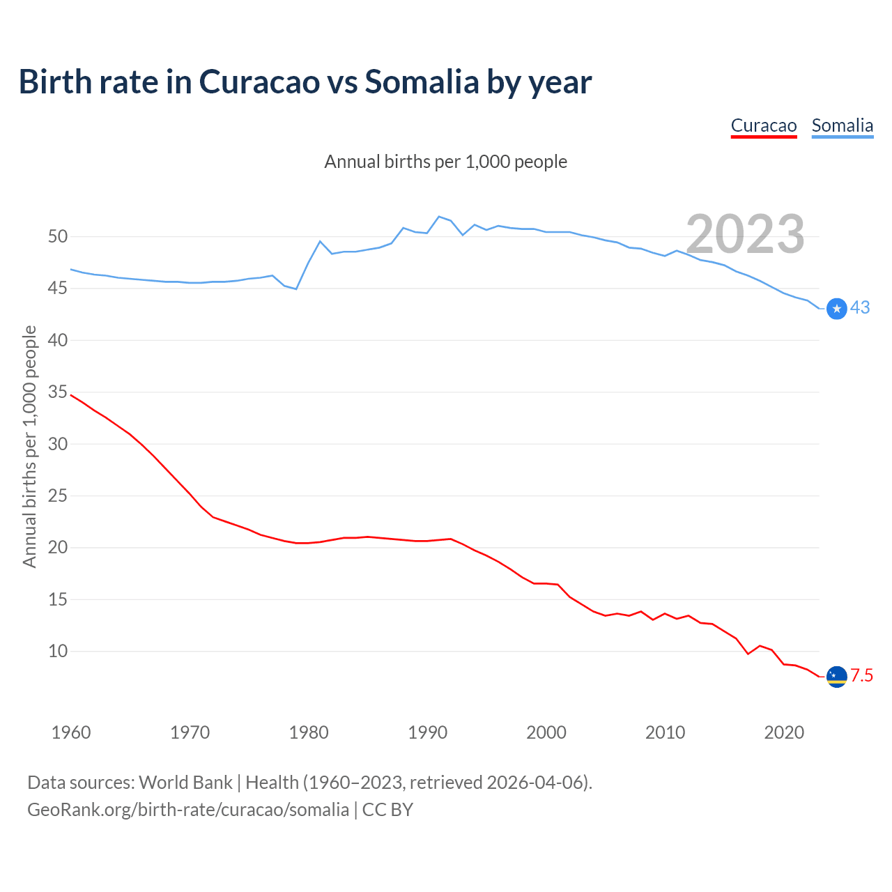 Curacao has an annual birth rate of 7.5 births per 1,000 people, compared to 43 for Somalia. The average number of children a woman is expected to have during her lifetime — the fertility rate, is 1.2 in Curacao and 6.13 in Somalia — 411% difference.