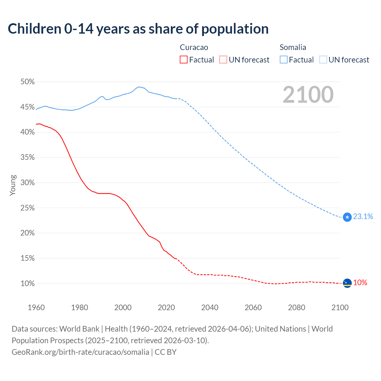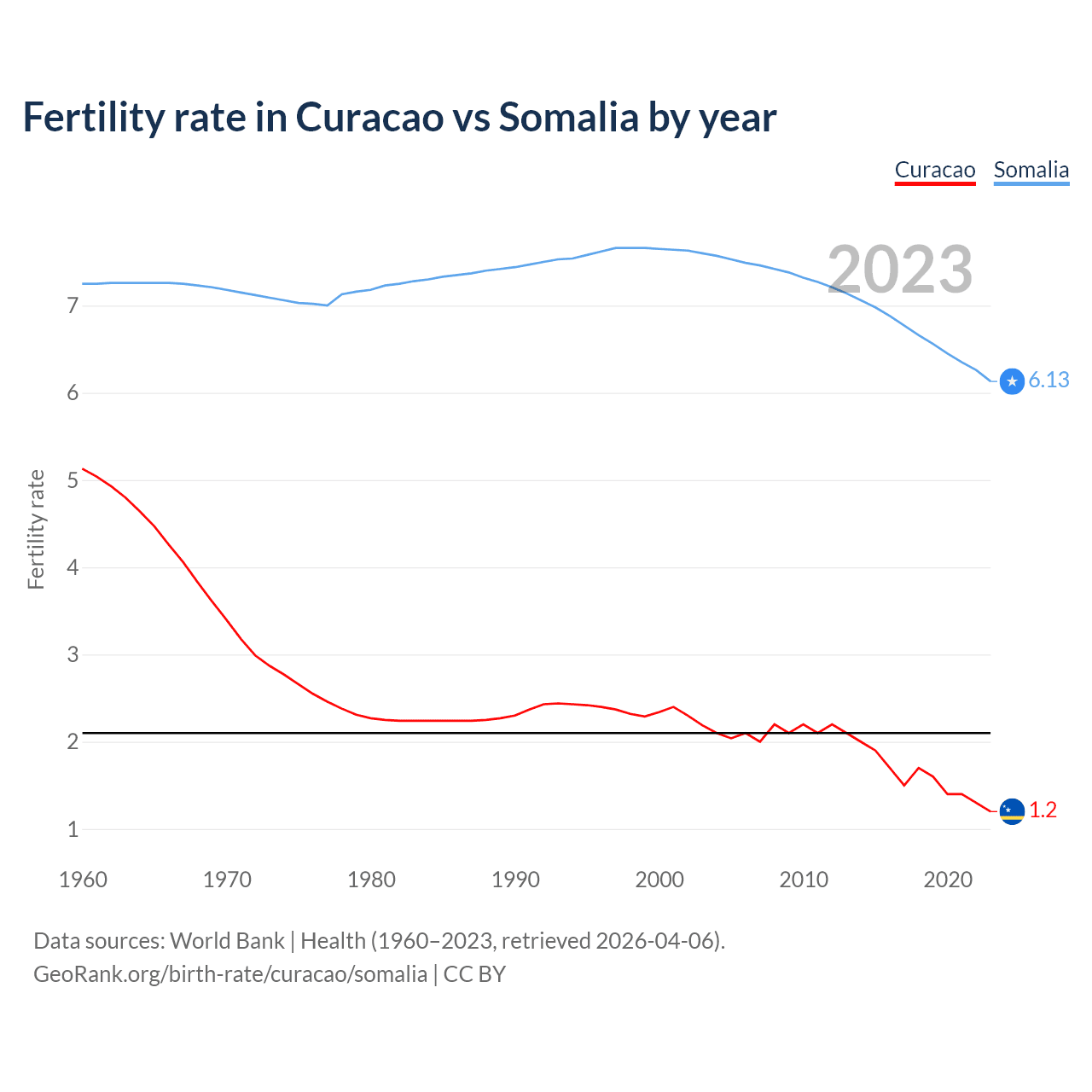 According to the latest available data on birth rates, the fertility rate in Curacao was 1.2 children per woman in 2023, compared to 6.13 in Somalia in 2023. The replacement level is considered to be 2.1 children per woman.