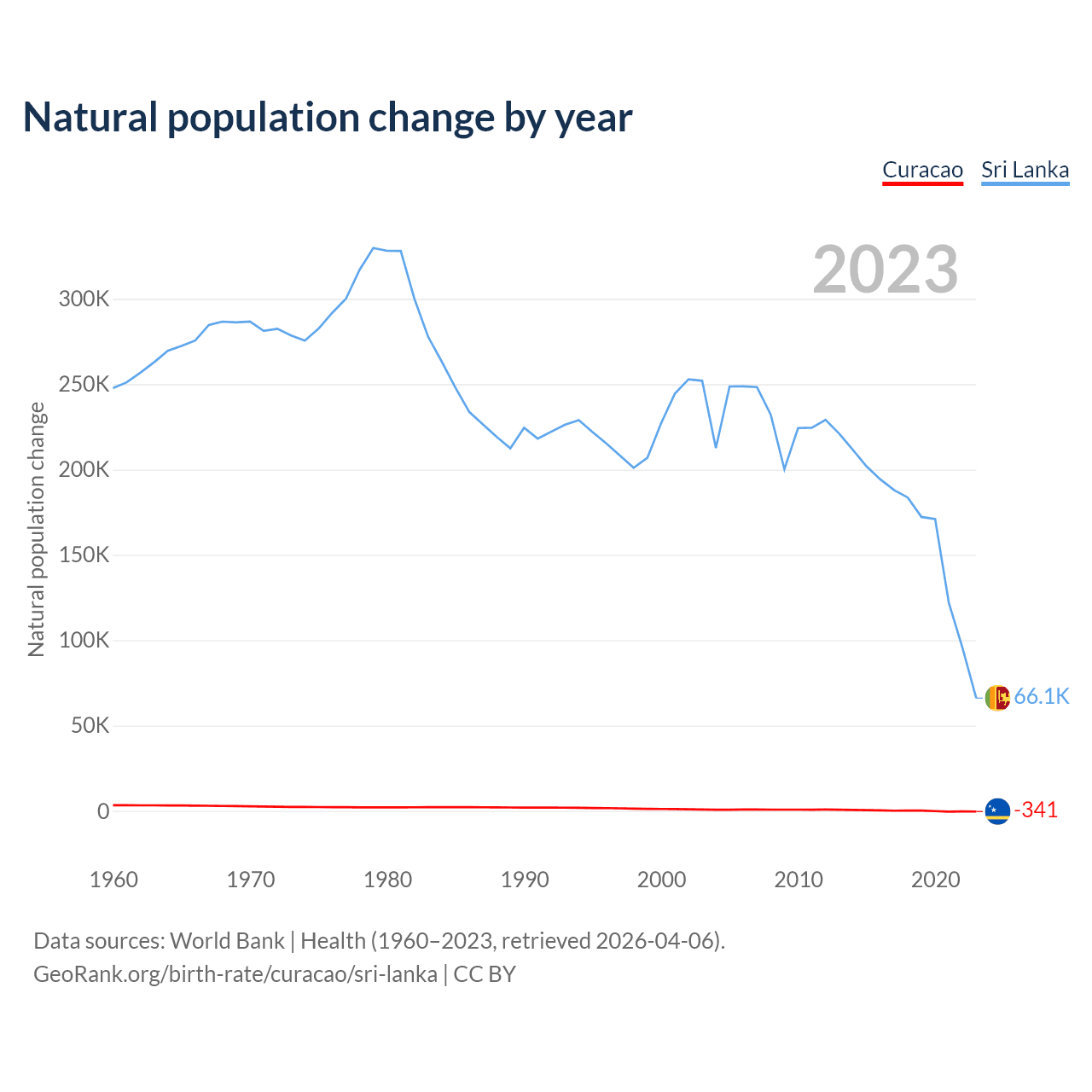According to the latest available data on birth rates, the fertility rate in Curacao was 1.2 children per woman in 2023, compared to 1.97 in Sri Lanka in 2023. The replacement level is considered to be 2.1 children per woman.
