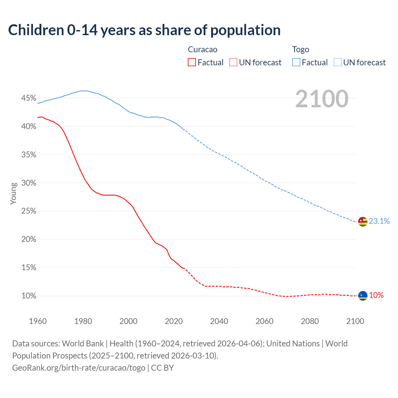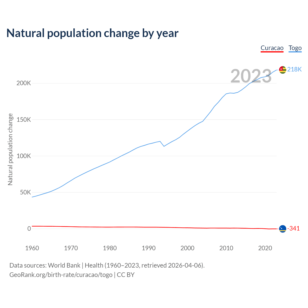 Curacao has an annual birth rate of 7.5 births per 1,000 people, compared to 31.1 for Togo. The average number of children a woman is expected to have during her lifetime — the fertility rate, is 1.2 in Curacao and 4.19 in Togo — 249.3% difference.