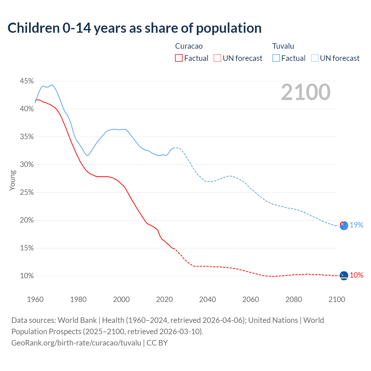 Curacao has an annual birth rate of 7.5 births per 1,000 people, compared to 23.1 for Tuvalu. The average number of children a woman is expected to have during her lifetime — the fertility rate, is 1.2 in Curacao and 3.21 in Tuvalu — 167.3% difference.