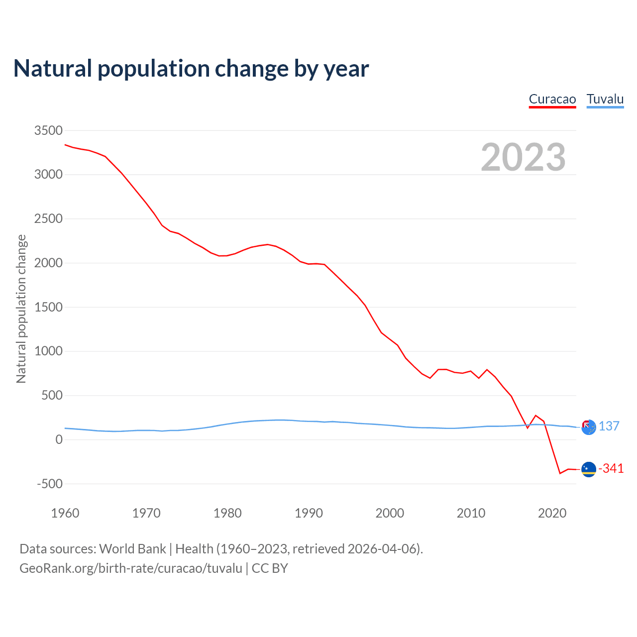 According to the latest available data on birth rates, the fertility rate in Curacao was 1.2 children per woman in 2023, compared to 3.21 in Tuvalu in 2023. The replacement level is considered to be 2.1 children per woman.