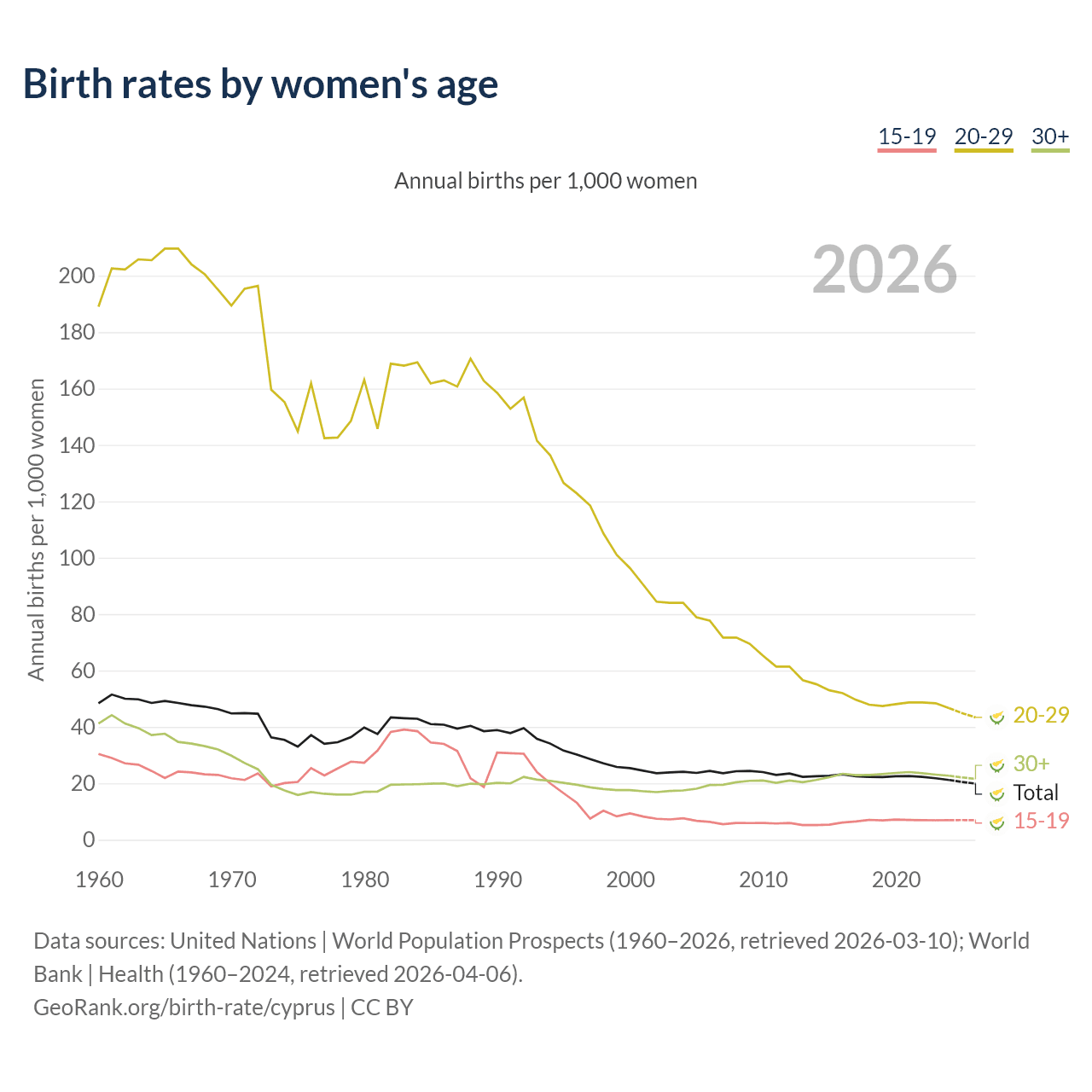 Cyprus has a birth rate of 10.8 (annual births per 1,000 people) and a fertility rate of 1.39 (the average number of children a woman is expected to have over her lifetime based on current age-specific birth rates).