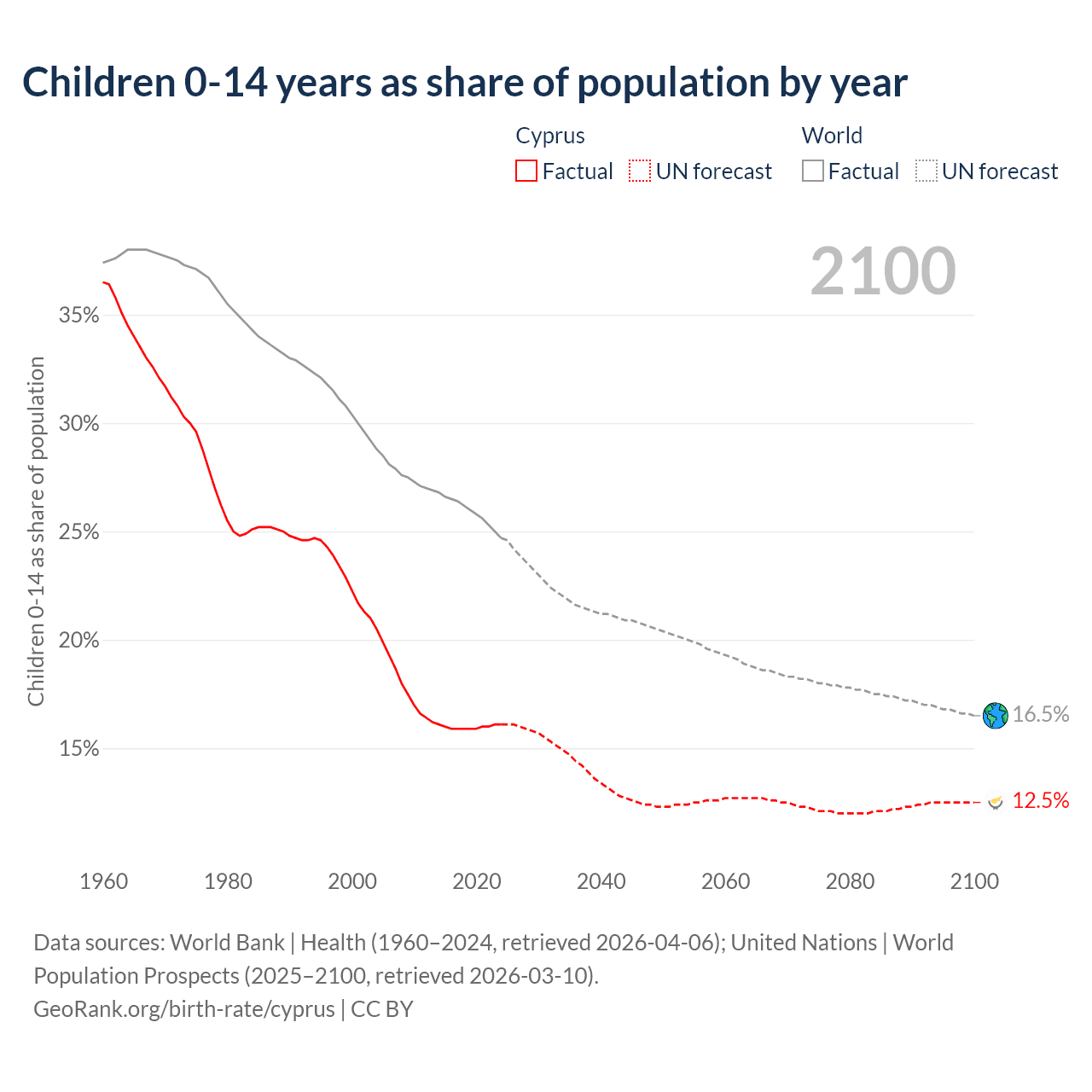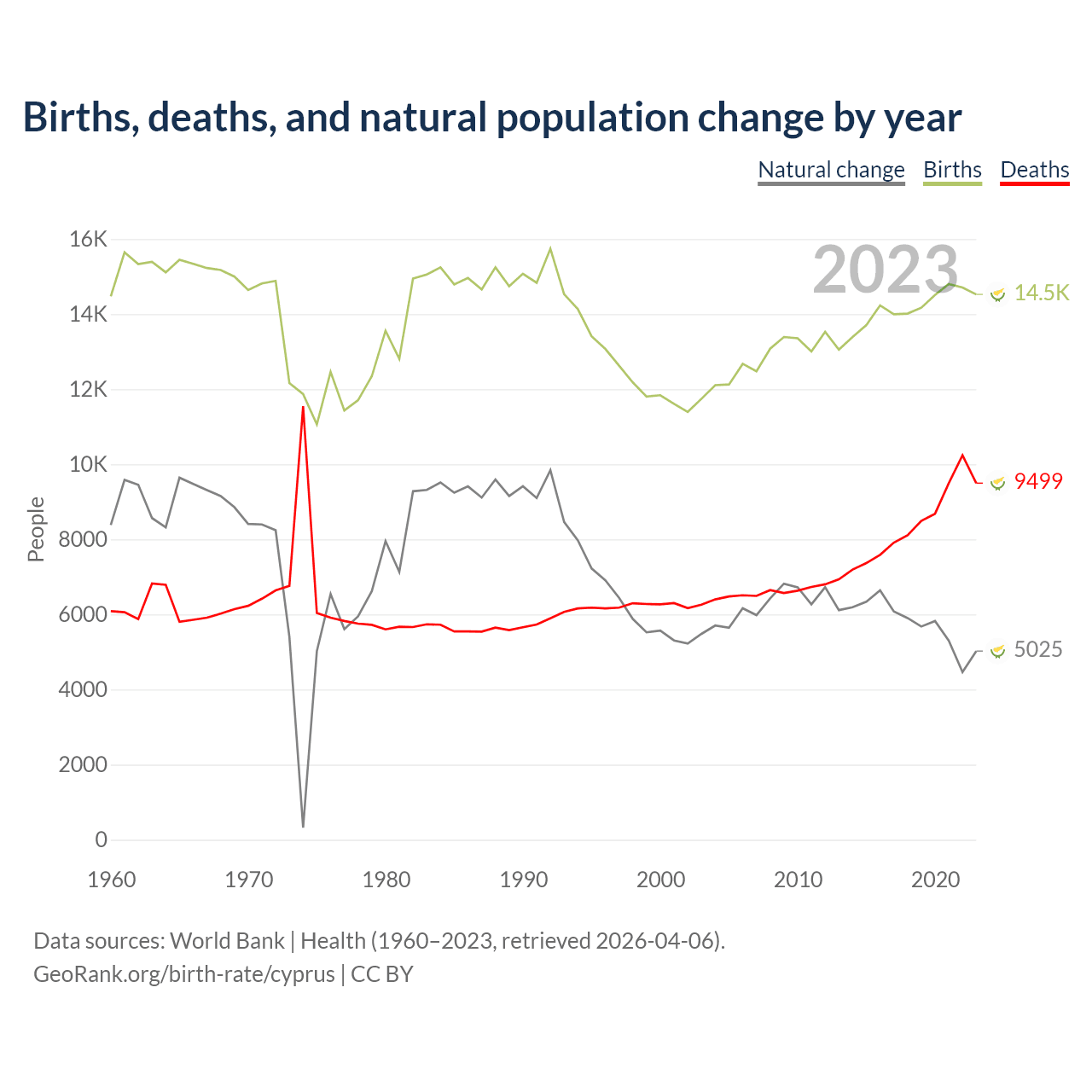 According to the latest birth rate data available, the fertility rate in Cyprus was 1.39 in 2023 and has been below the replacement level of 2.1 children per woman since 1995. In 1993, the fertility rate was 2.25 — a 38.2% decline in 30 years.