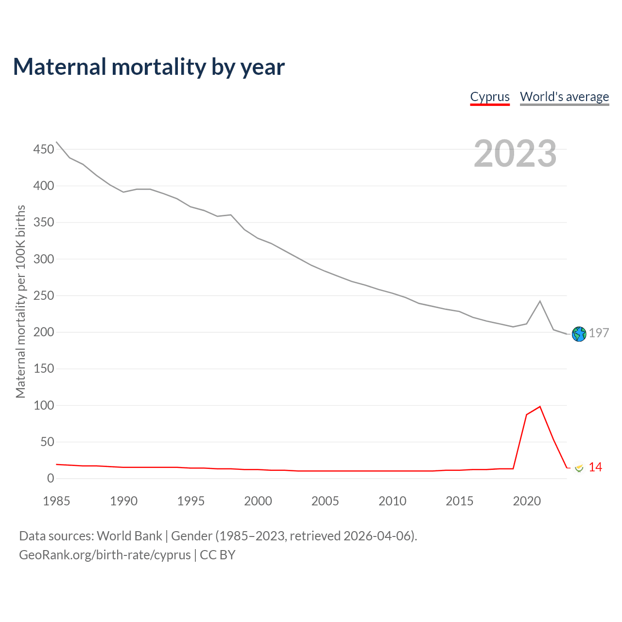 The maternal mortality rate in Cyprus was 14 deaths per 100,000 live births in 2023 — a 0.01% chance of dying during childbirth or within 42 days of pregnancy termination. This is a 16.7% increase compared to the year 2000.