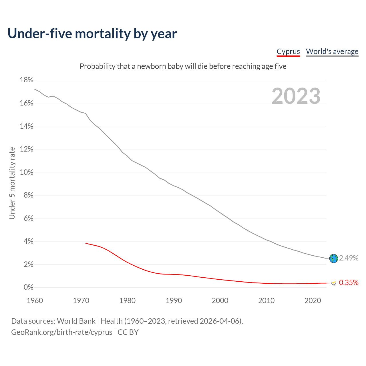 The under-5 mortality rate in Cyprus was 3.5 deaths per 1,000 live births in 2023 — a 0.35% chance that a newborn baby will die before reaching age five. This is down from 6.6 deaths per 1,000 live births in 2000.