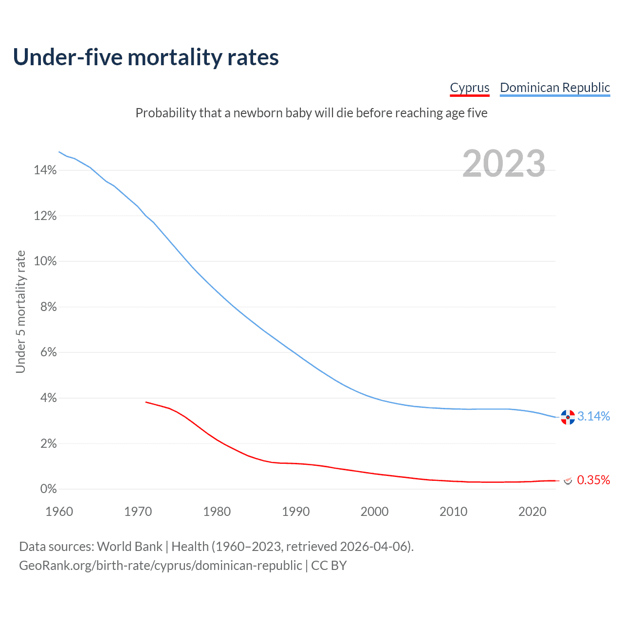 The chance that a newborn baby will die before reaching age five is 0.35% in Cyprus and 3.14% in the Dominican Republic. Above is a chart with historical data on under-five mortality rates.