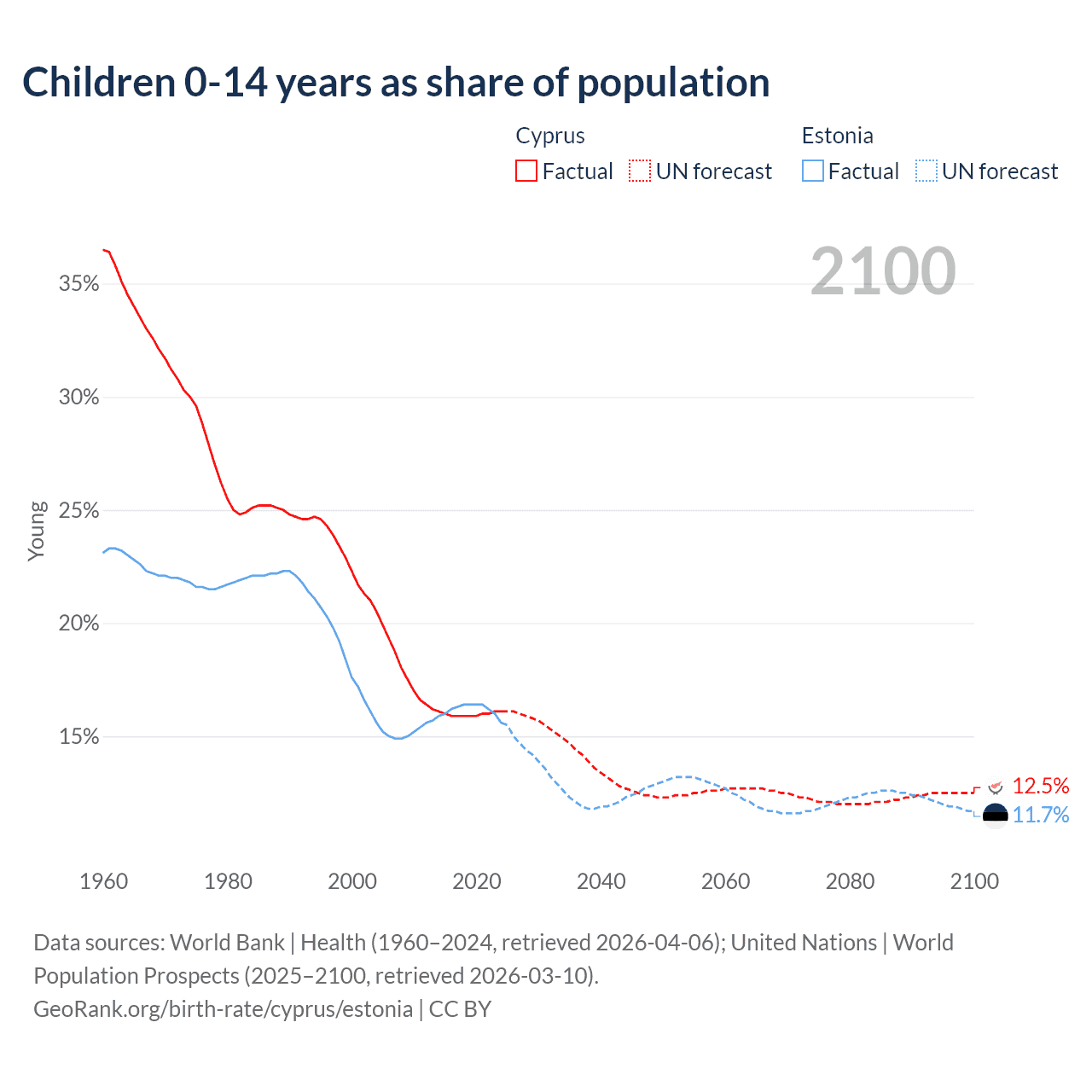 According to the latest available data on birth rates, the fertility rate in Cyprus was 1.39 children per woman in 2023, compared to 1.31 in Estonia in 2023. The replacement level is considered to be 2.1 children per woman.