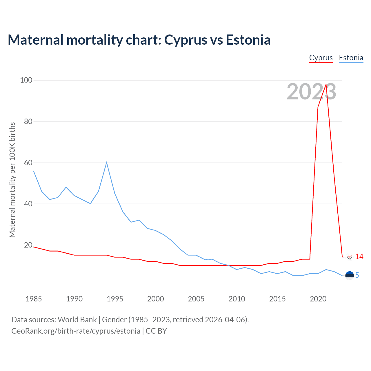 The maternal mortality rate, which is the probability of dying during childbirth or within 42 days of pregnancy termination, is 14 deaths per 100,000 live births in Cyprus, compared to 5 deaths in Estonia.