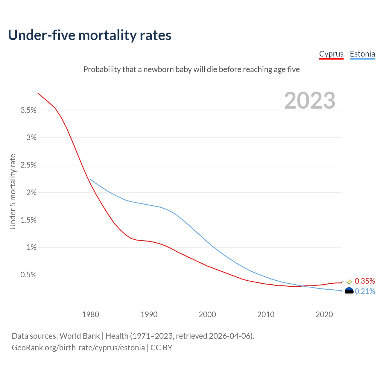 The chance that a newborn baby will die before reaching age five is 0.35% in Cyprus and 0.21% in Estonia. Above is a chart with historical data on under-five mortality rates.