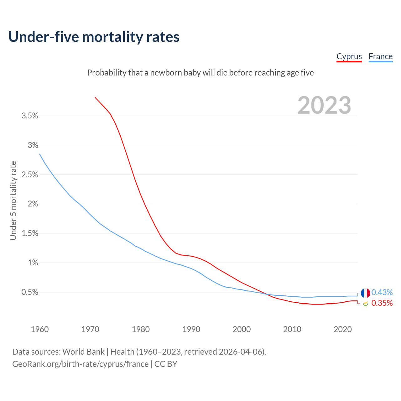 The chance that a newborn baby will die before reaching age five is 0.35% in Cyprus and 0.43% in France. Above is a chart with historical data on under-five mortality rates.