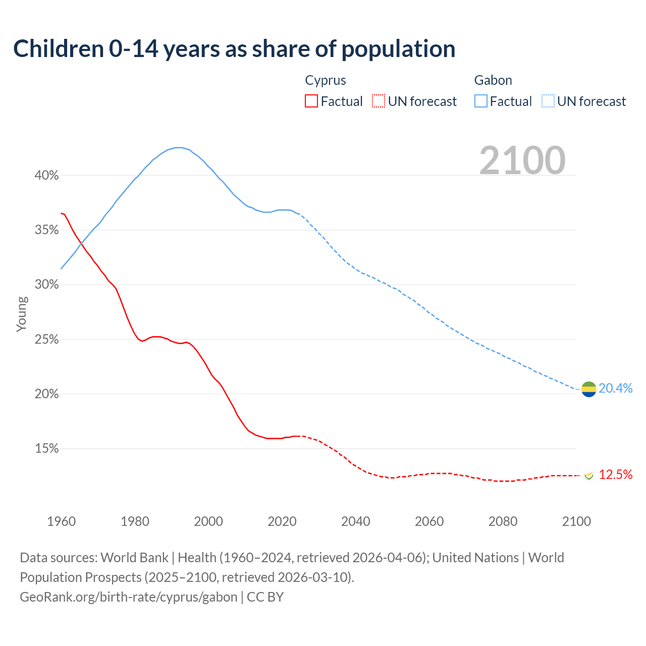 Cyprus has an annual birth rate of 10.8 births per 1,000 people, compared to 27.7 for Gabon. The average number of children a woman is expected to have during her lifetime — the fertility rate, is 1.39 in Cyprus and 3.65 in Gabon — 162.6% difference.