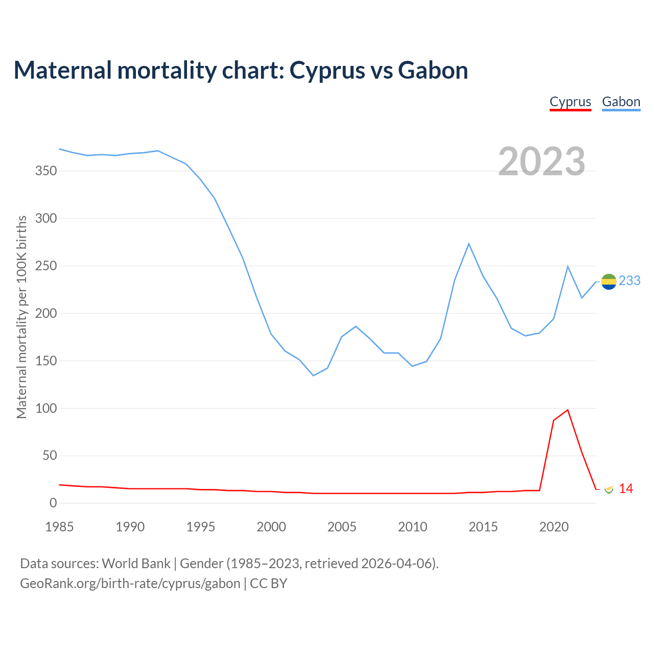 The maternal mortality rate, which is the probability of dying during childbirth or within 42 days of pregnancy termination, is 14 deaths per 100,000 live births in Cyprus, compared to 233 deaths in Gabon.