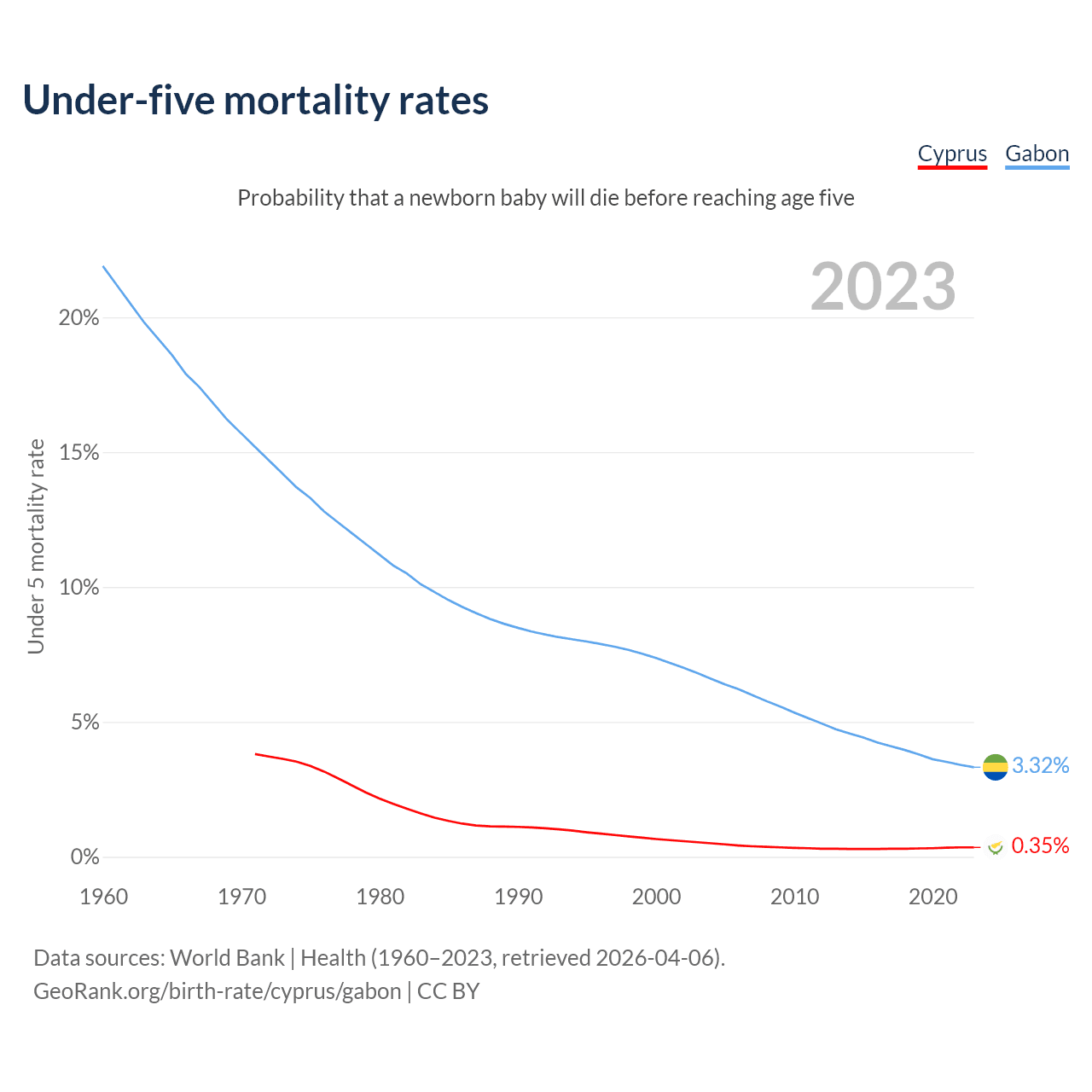 The chance that a newborn baby will die before reaching age five is 0.35% in Cyprus and 3.32% in Gabon. Above is a chart with historical data on under-five mortality rates.