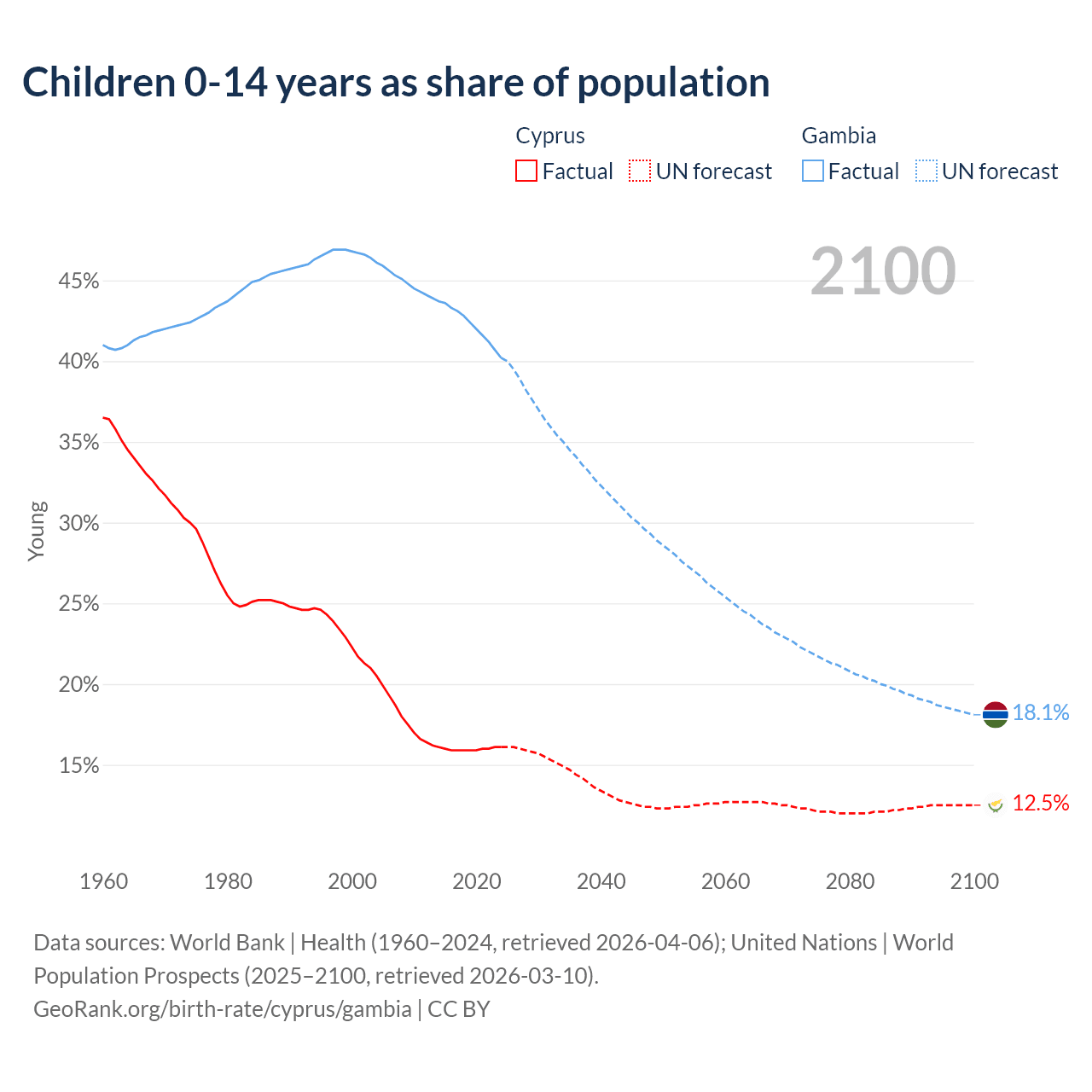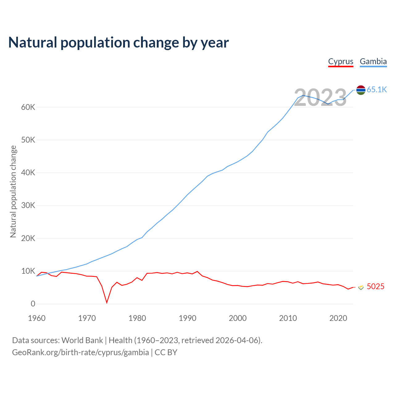 Cyprus has an annual birth rate of 10.8 births per 1,000 people, compared to 30.4 for the Gambia. The average number of children a woman is expected to have during her lifetime — the fertility rate, is 1.39 in Cyprus and 4.01 in the Gambia — 188.4% difference.