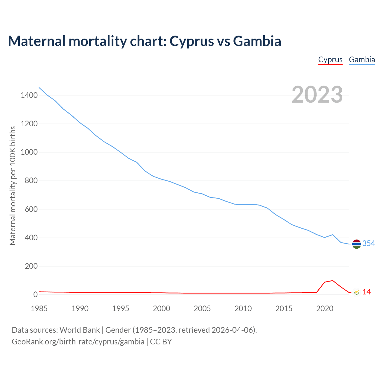 The maternal mortality rate, which is the probability of dying during childbirth or within 42 days of pregnancy termination, is 14 deaths per 100,000 live births in Cyprus, compared to 354 deaths in the Gambia.