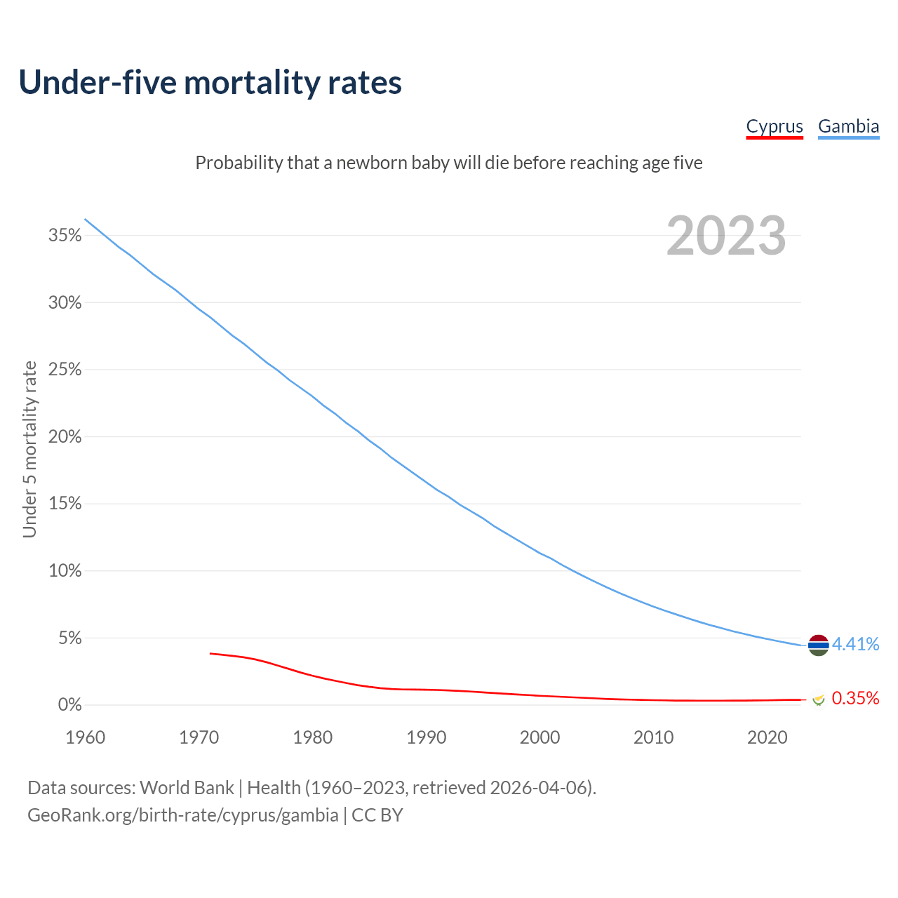 The chance that a newborn baby will die before reaching age five is 0.35% in Cyprus and 4.41% in the Gambia. Above is a chart with historical data on under-five mortality rates.