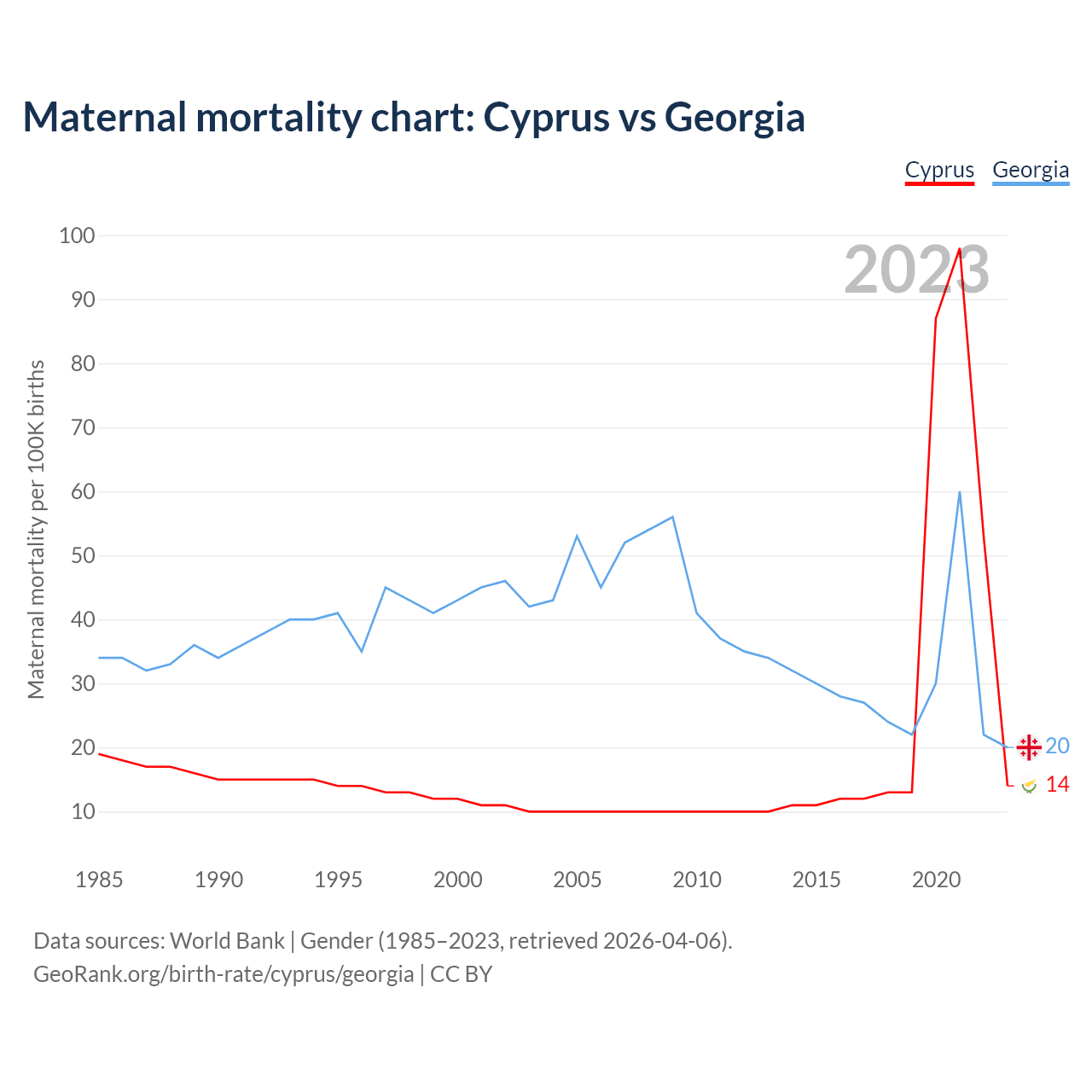 The maternal mortality rate, which is the probability of dying during childbirth or within 42 days of pregnancy termination, is 14 deaths per 100,000 live births in Cyprus, compared to 20 deaths in Georgia.