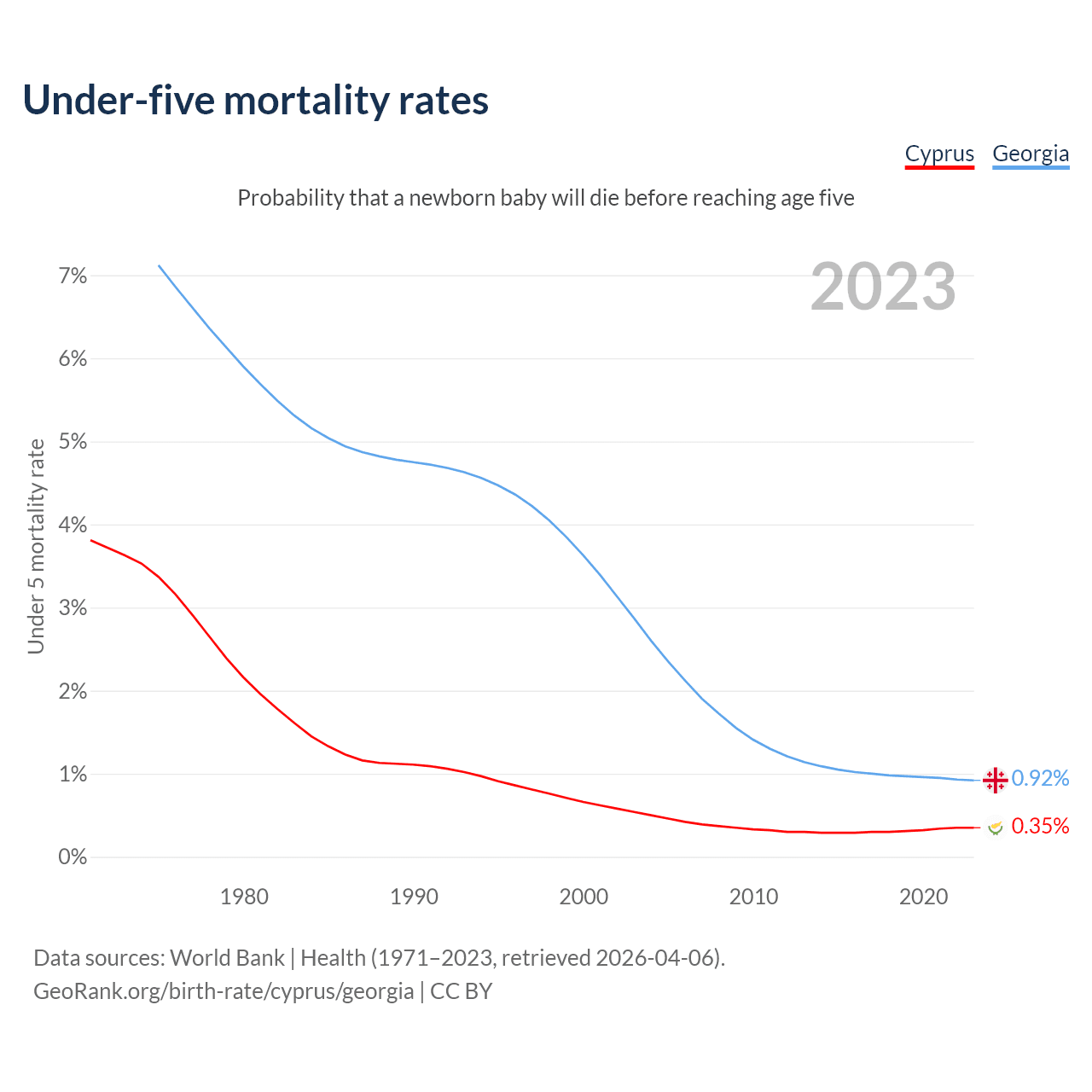 The chance that a newborn baby will die before reaching age five is 0.35% in Cyprus and 0.92% in Georgia. Above is a chart with historical data on under-five mortality rates.