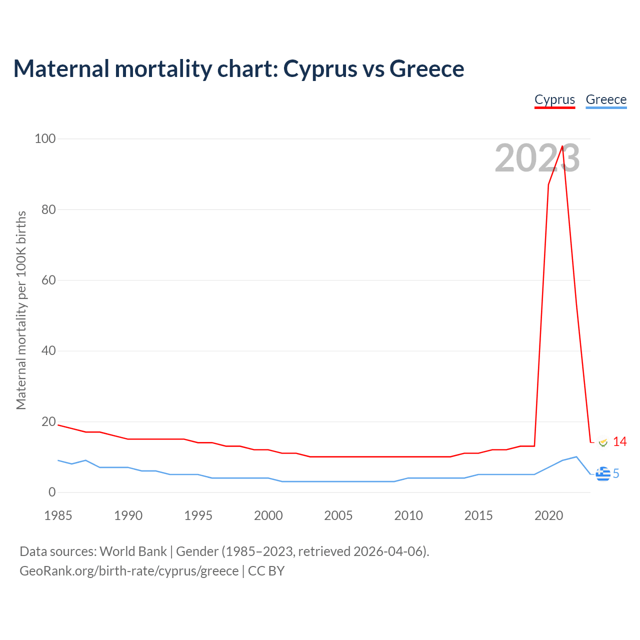 The maternal mortality rate, which is the probability of dying during childbirth or within 42 days of pregnancy termination, is 14 deaths per 100,000 live births in Cyprus, compared to 5 deaths in Greece.