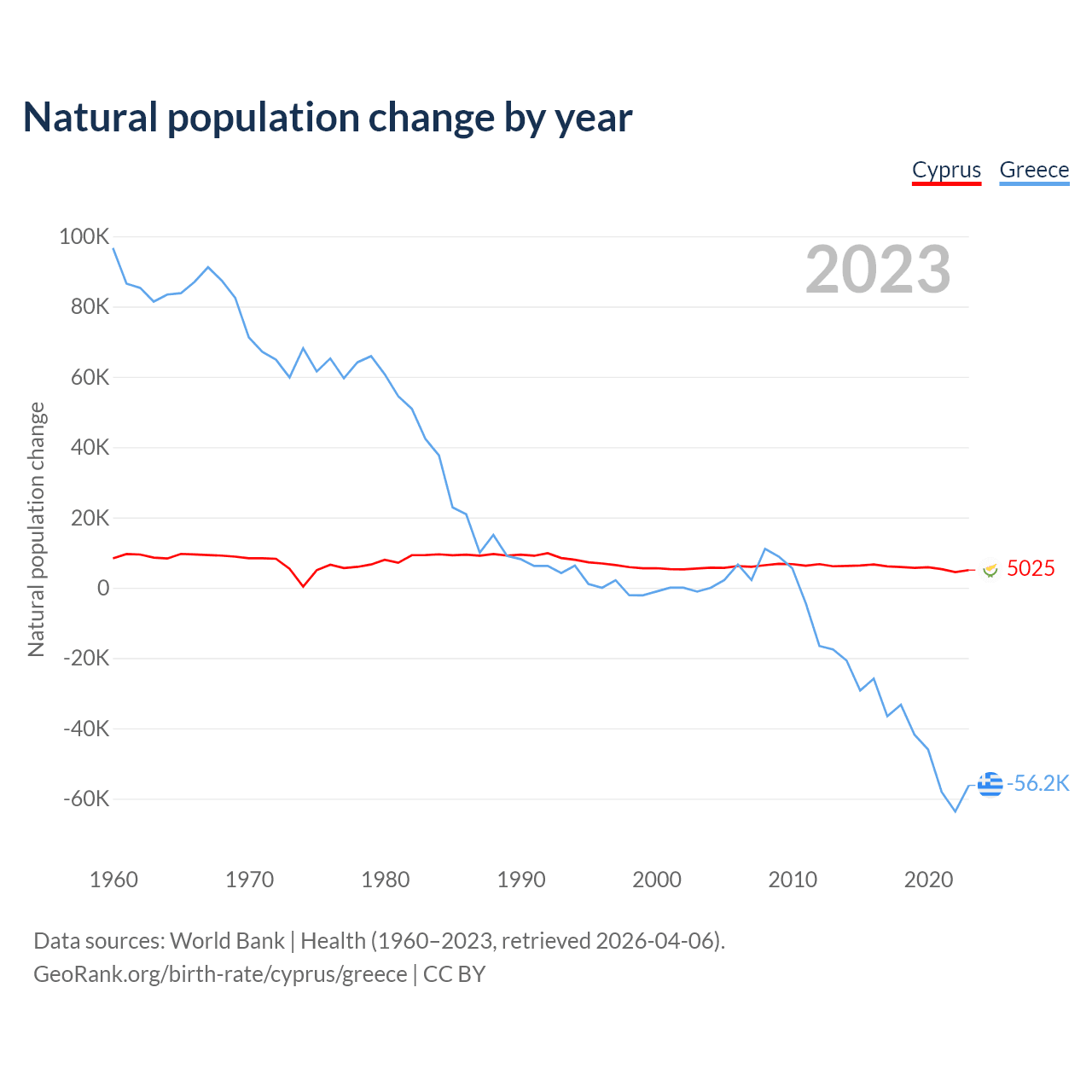 1960 vs 2023, the fertility rate has decreased by 59.1% in Cyprus and by 40.8% in Greece — in 1960, it was 3.39 and 2.23, respectively.