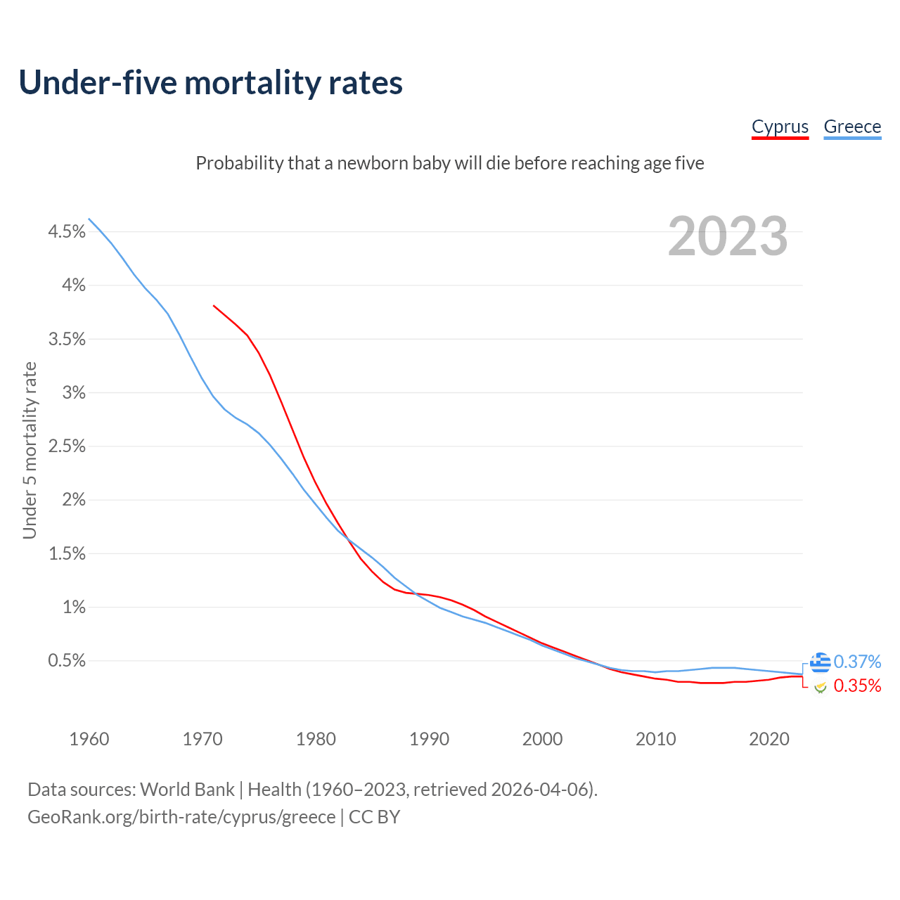 The chance that a newborn baby will die before reaching age five is 0.35% in Cyprus and 0.37% in Greece. Above is a chart with historical data on under-five mortality rates.
