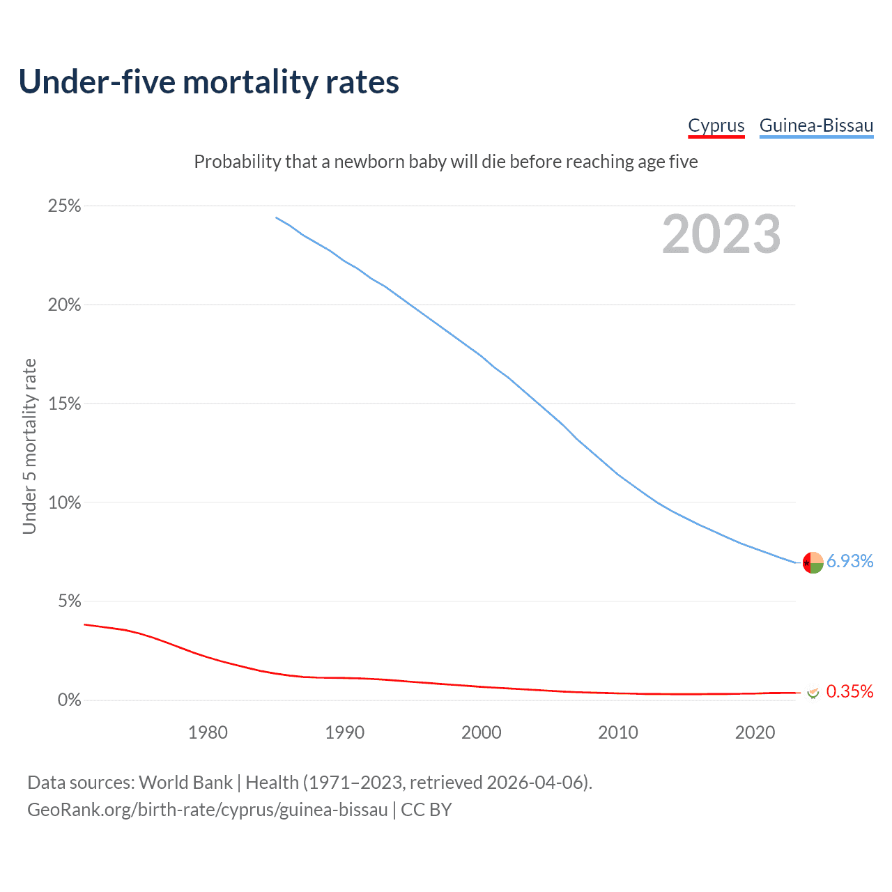 The chance that a newborn baby will die before reaching age five is 0.35% in Cyprus and 6.93% in Guinea-Bissau. Above is a chart with historical data on under-five mortality rates.