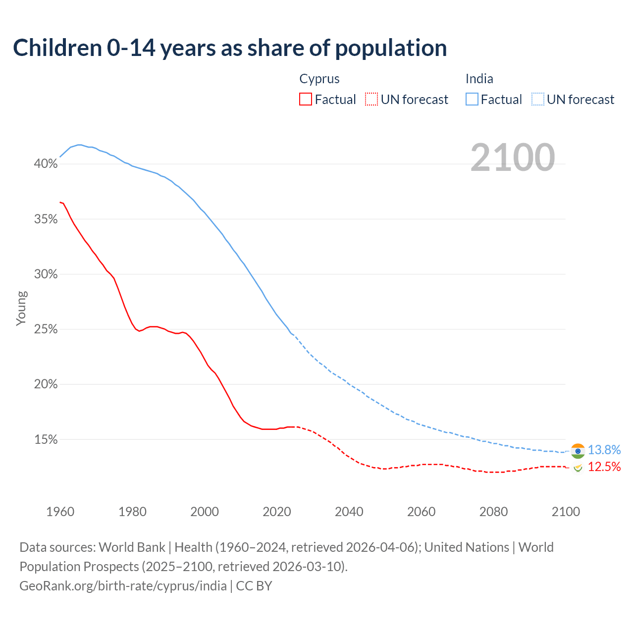 According to the latest available data on birth rates, the fertility rate in Cyprus was 1.39 children per woman in 2023, compared to 1.98 in India in 2023. The replacement level is considered to be 2.1 children per woman.
