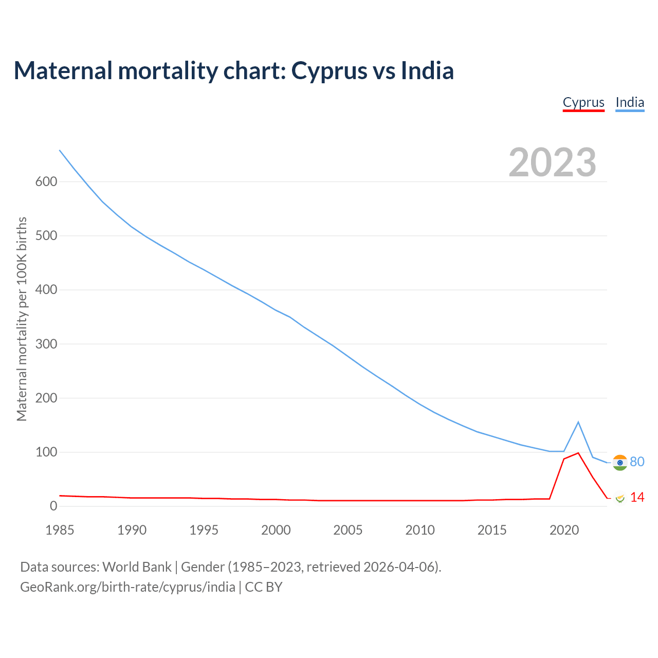 The maternal mortality rate, which is the probability of dying during childbirth or within 42 days of pregnancy termination, is 14 deaths per 100,000 live births in Cyprus, compared to 80 deaths in India.