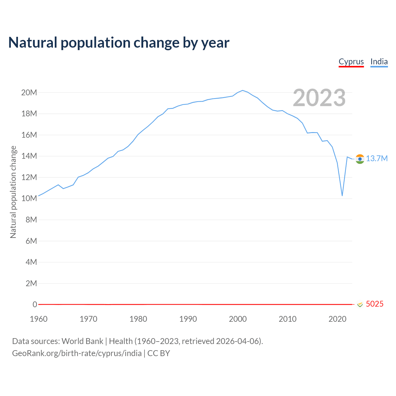 Cyprus has an annual birth rate of 10.8 births per 1,000 people, compared to 16.1 for India. The average number of children a woman is expected to have during her lifetime — the fertility rate, is 1.39 in Cyprus and 1.98 in India — 42.2% difference.