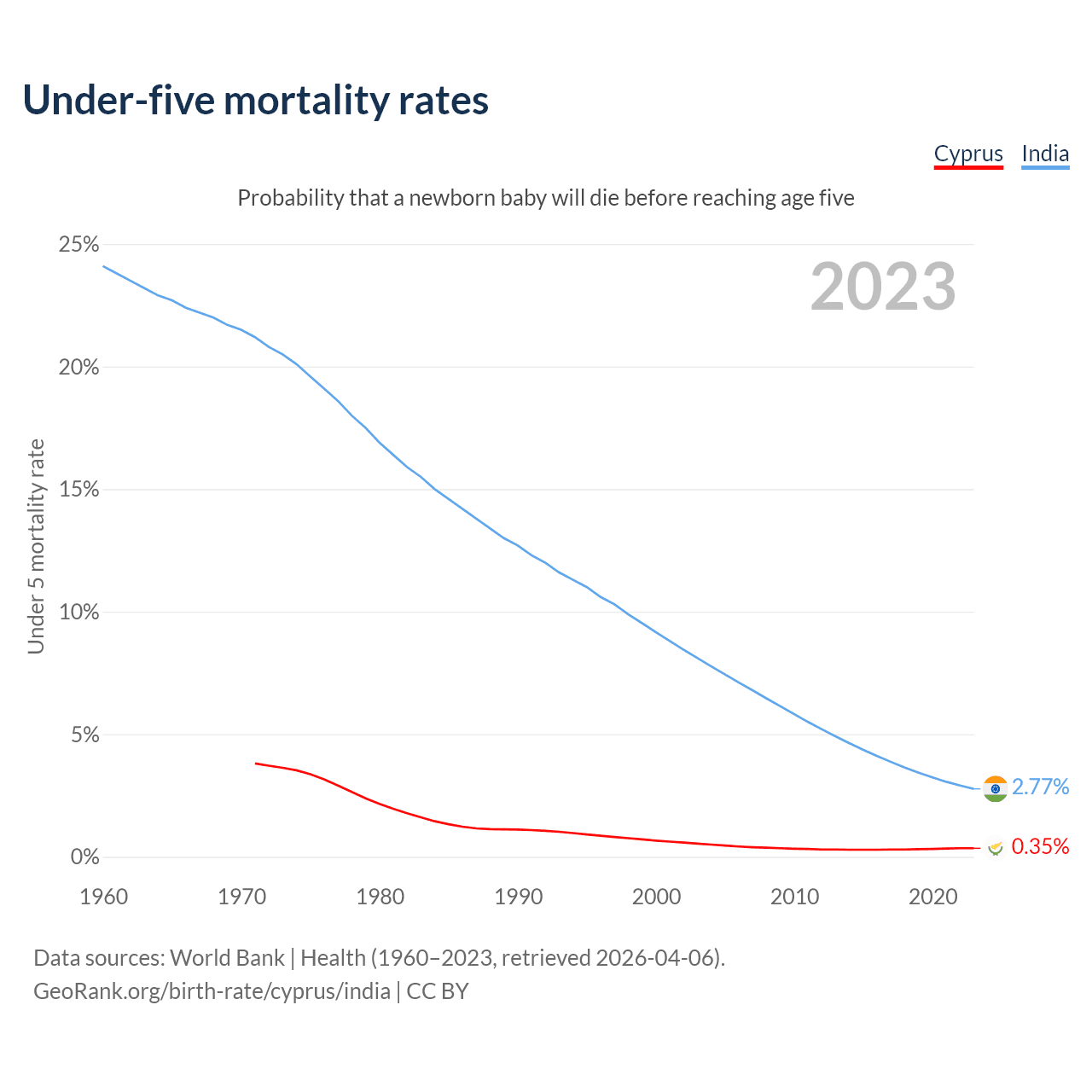 The chance that a newborn baby will die before reaching age five is 0.35% in Cyprus and 2.77% in India. Above is a chart with historical data on under-five mortality rates.