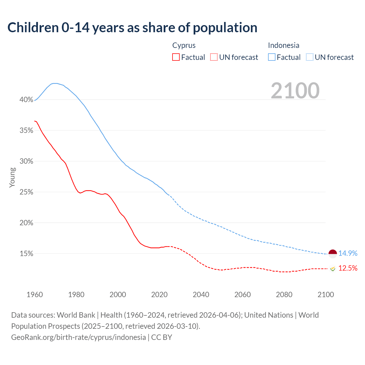 According to the latest available data on birth rates, the fertility rate in Cyprus was 1.39 children per woman in 2023, compared to 2.13 in Indonesia in 2023. The replacement level is considered to be 2.1 children per woman.