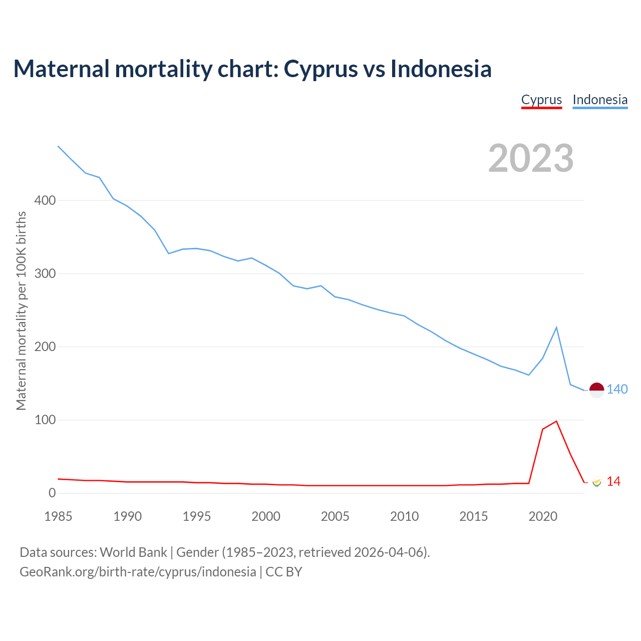 The maternal mortality rate, which is the probability of dying during childbirth or within 42 days of pregnancy termination, is 14 deaths per 100,000 live births in Cyprus, compared to 140 deaths in Indonesia.